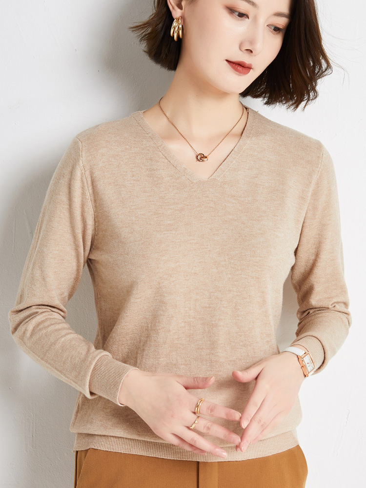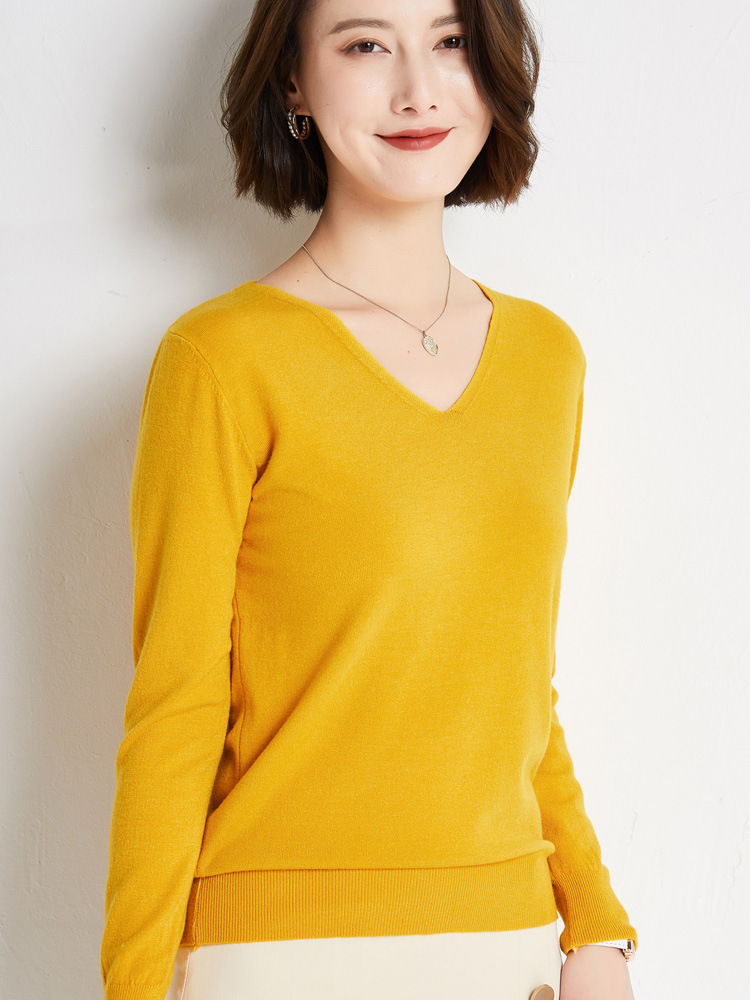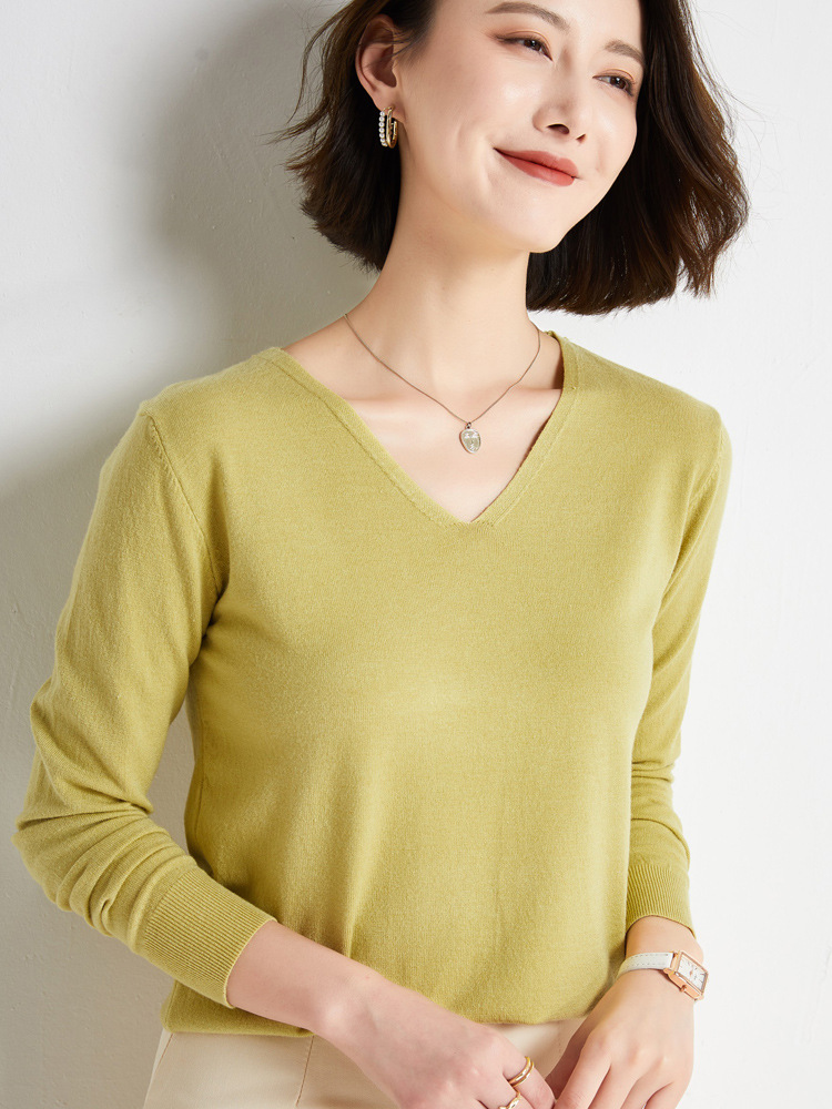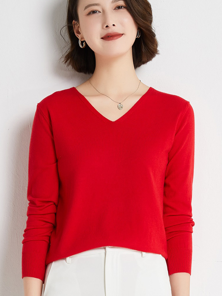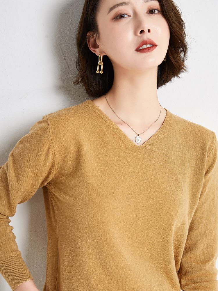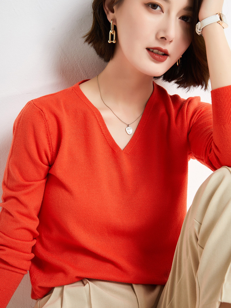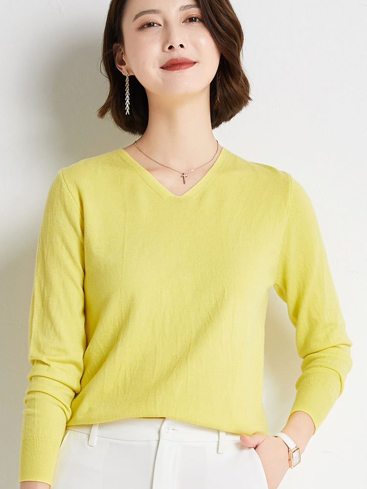 초가을 브이넥 풀오버 스웨터 여성용 신상 단색 긴팔 여성복 짧은 루즈핏 상의 베이스 셔츠 해외 도매