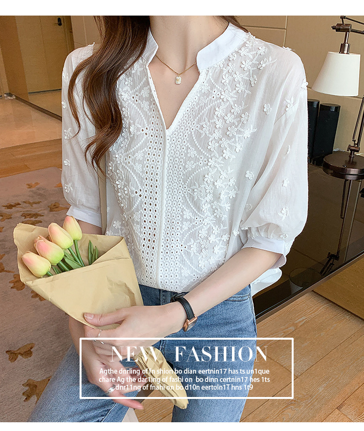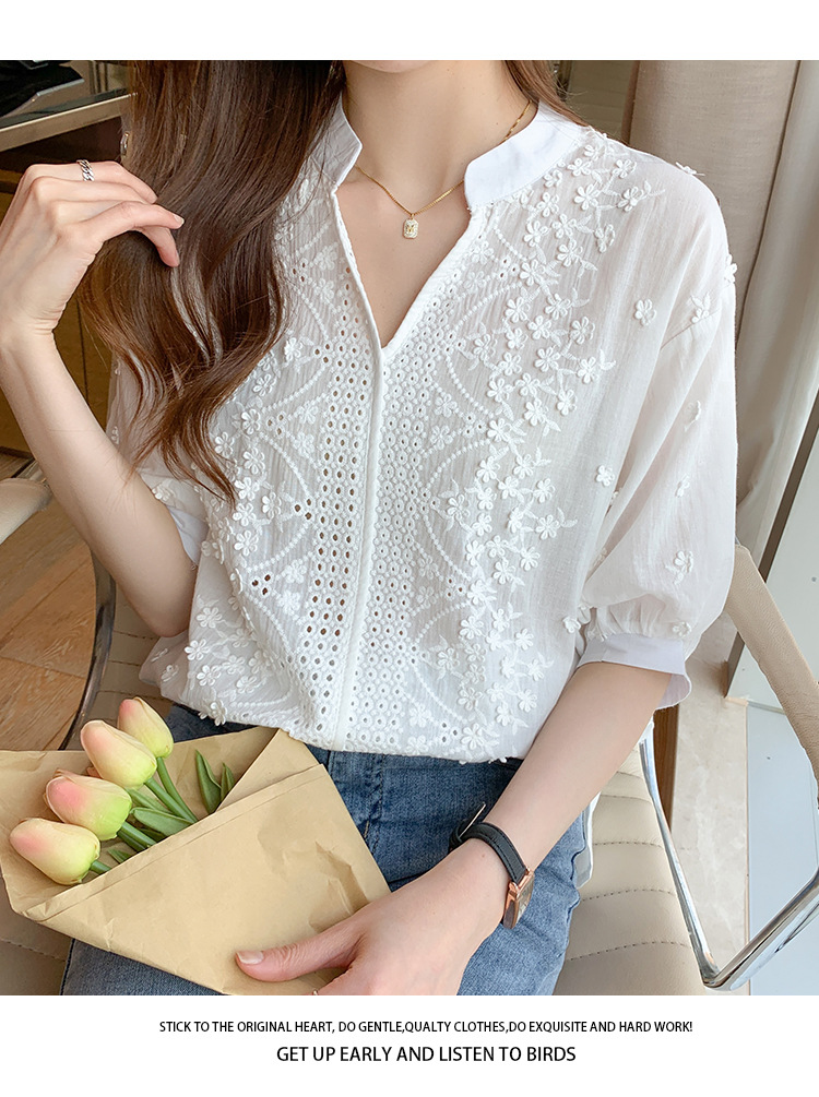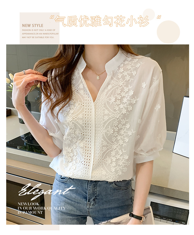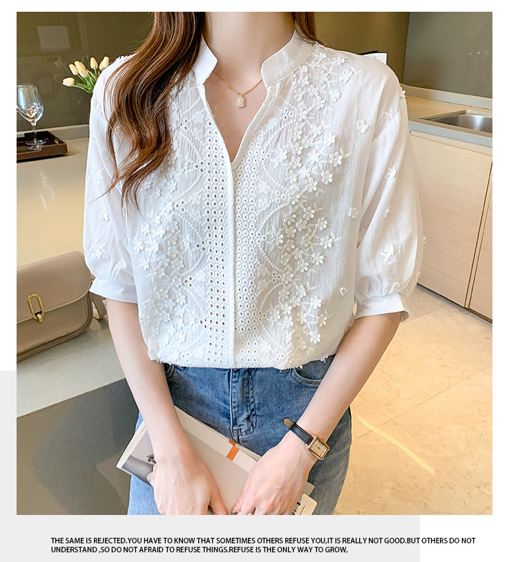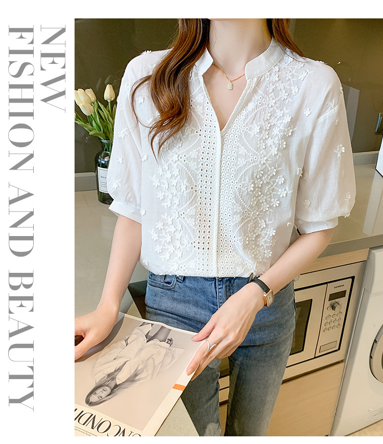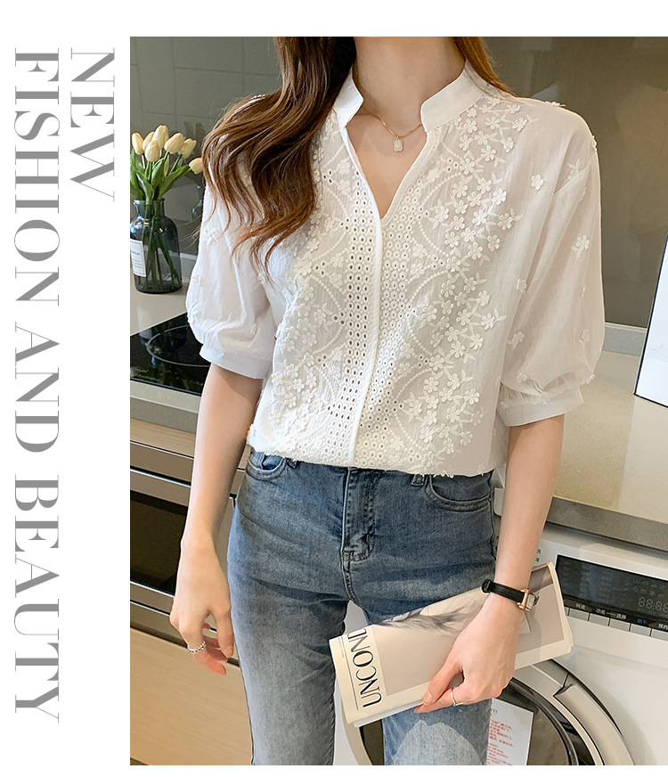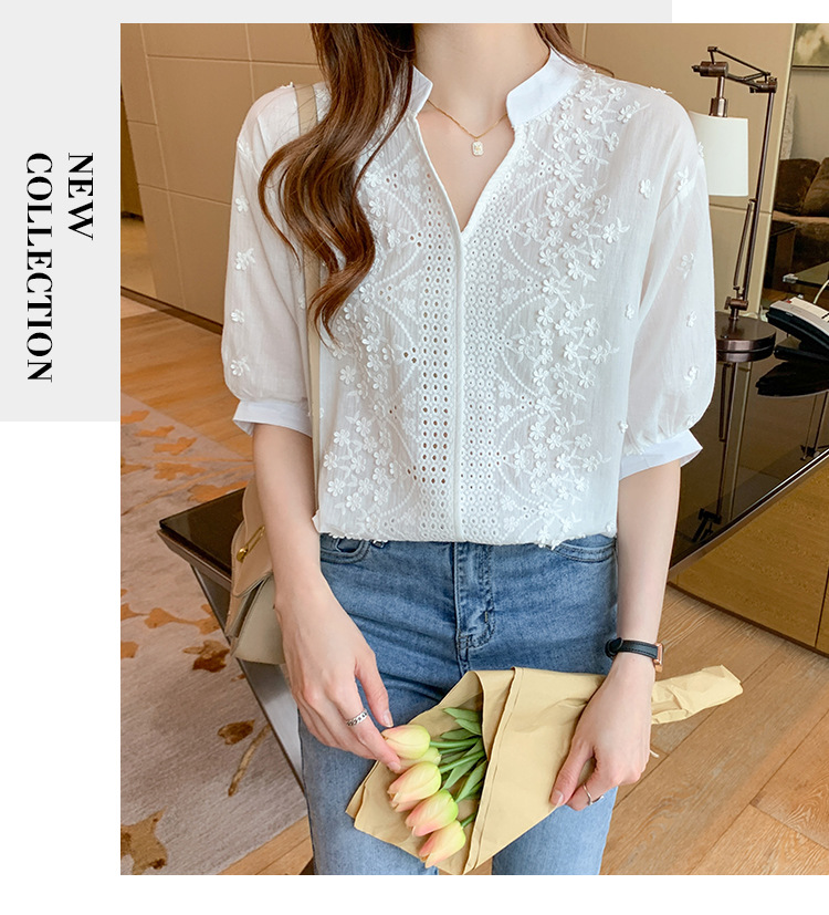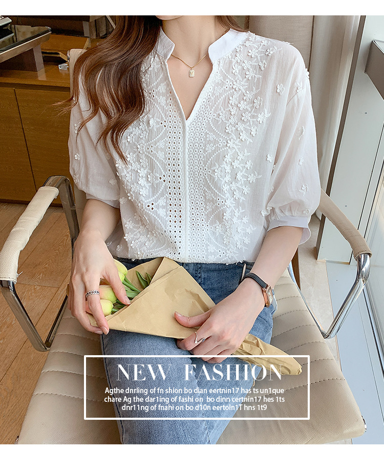 2023 새로운 흰색 셔츠 여성용 디자인 센스 V-넥 입체 자수 자카드 레이스 퍼프 슬리브 베이스 셔츠스토어 가기