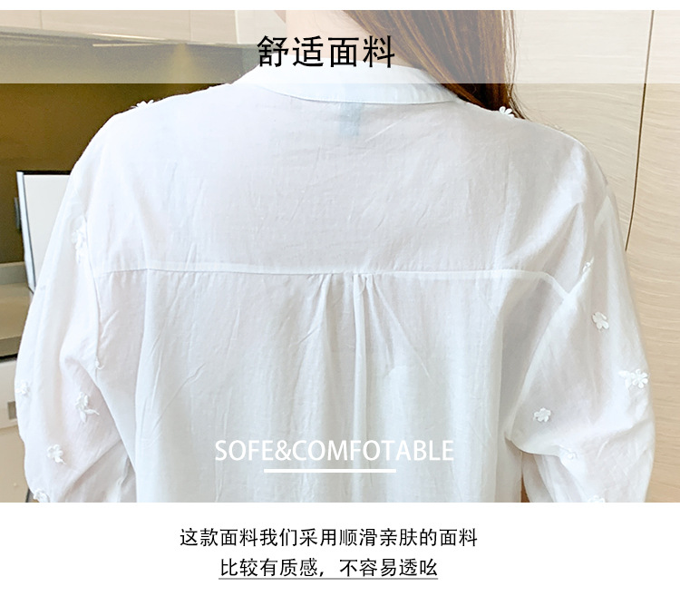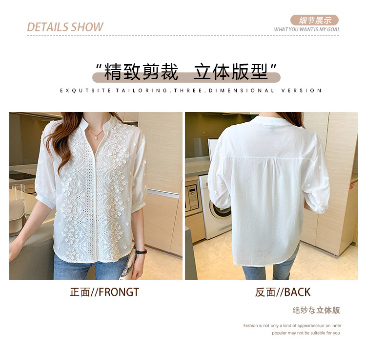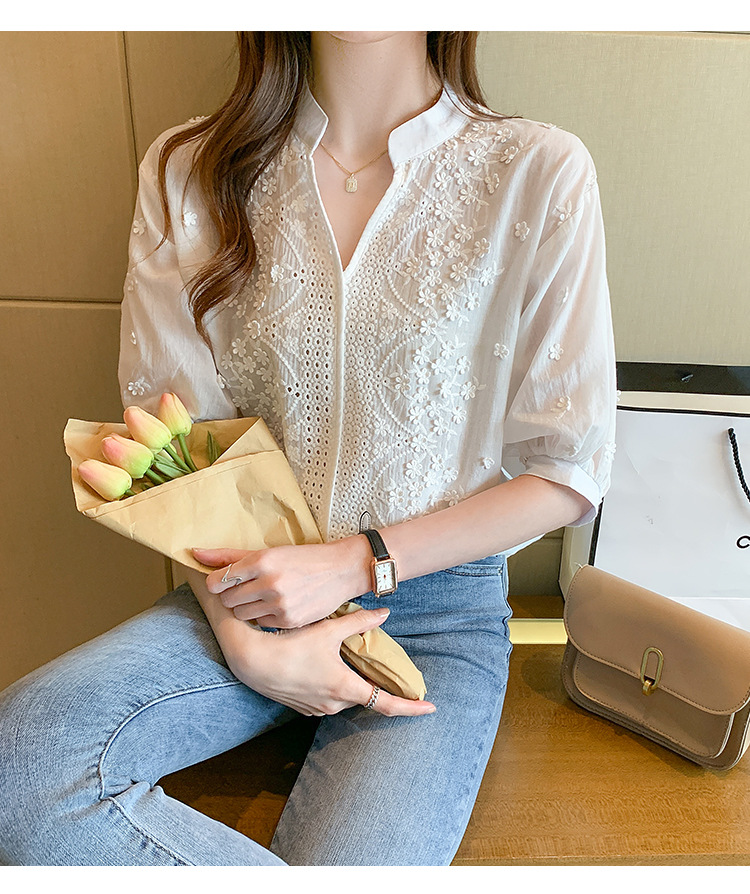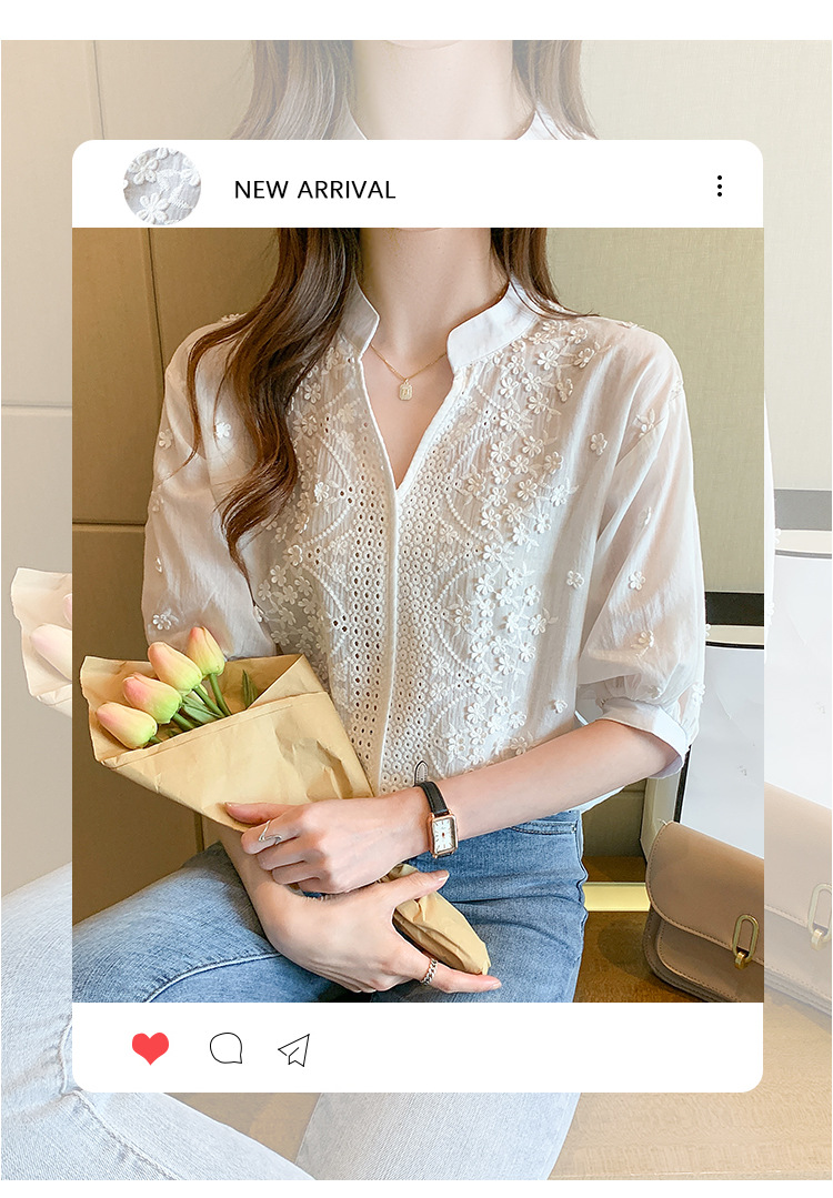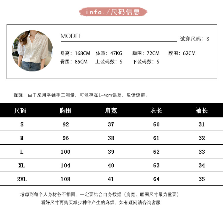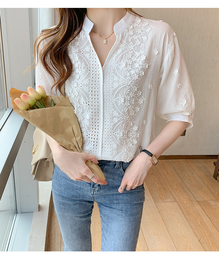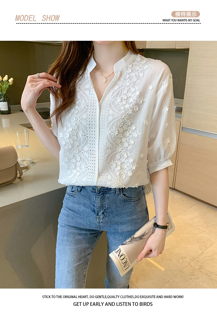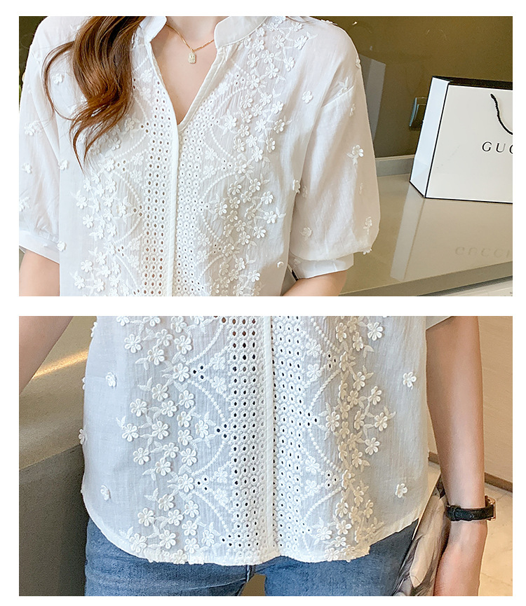 2023 새로운 흰색 셔츠 여성용 디자인 센스 V-넥 입체 자수 자카드 레이스 퍼프 슬리브 베이스 셔츠스토어 가기