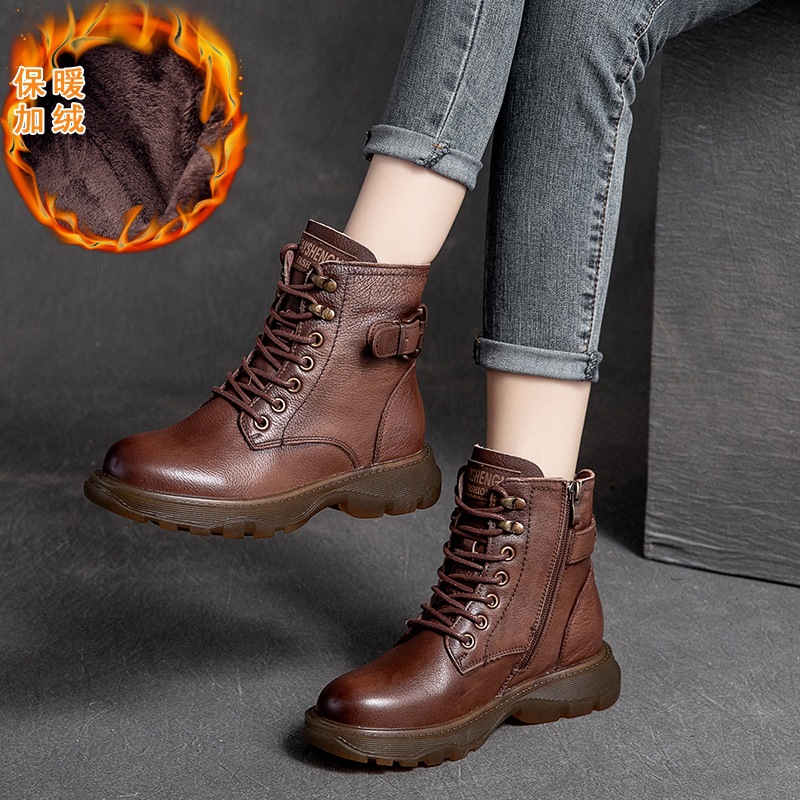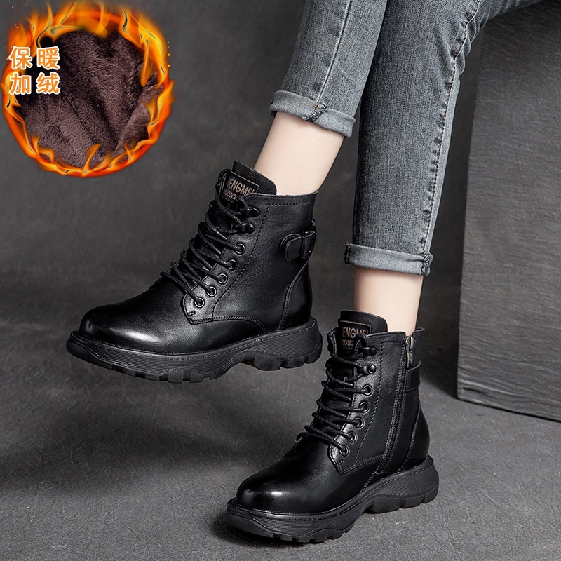 상하이 제일주 가을과 겨울 신작 2021 소가죽 두꺼운 단색 벨트 버클 프론트 레이스 업 마틴 부츠 여성용 로우 배럴 싱글 부츠스토어 가기