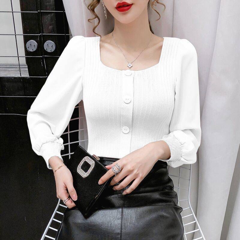 커버 팔 봄 새로운 스타일 스퀘어 칼라 셔츠 탑 여성용 슬림 핏 슬리밍 긴 소매 쉬폰 퍼프 슬리브 니트 셔츠