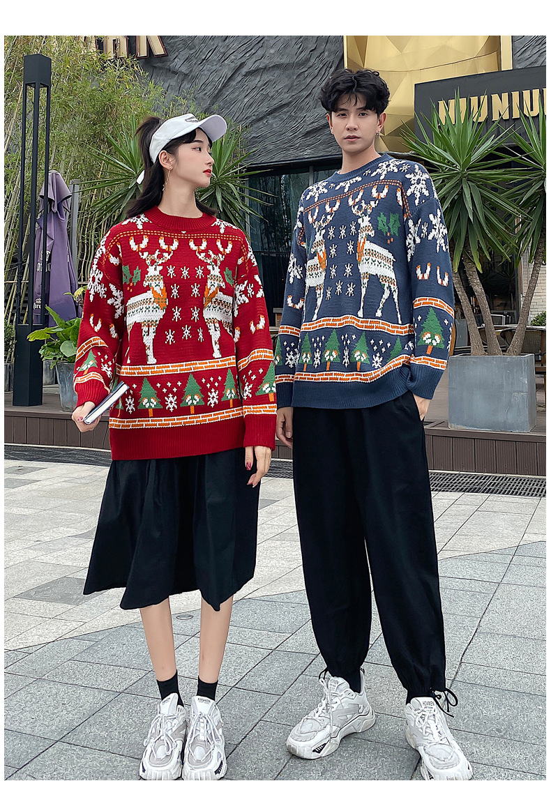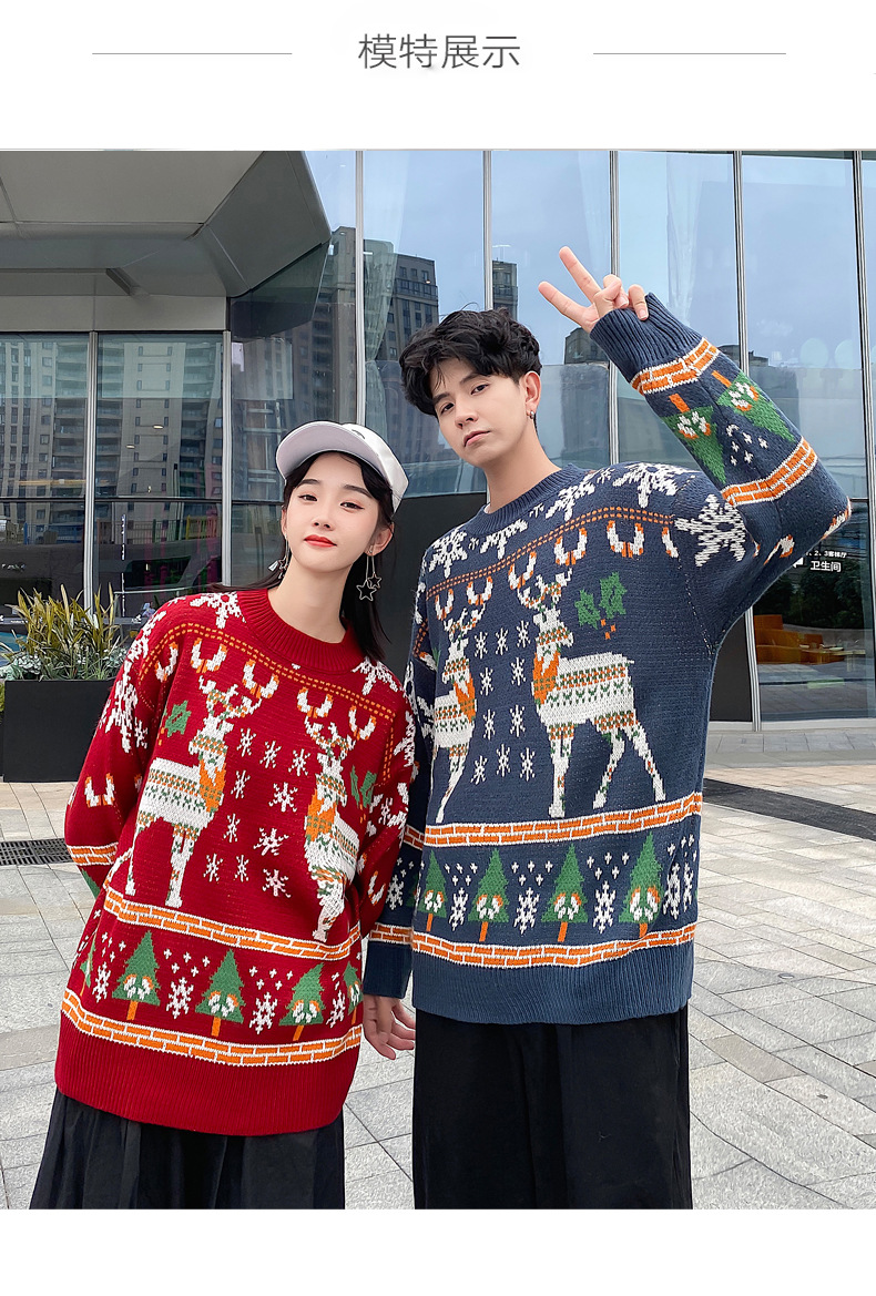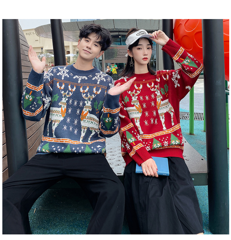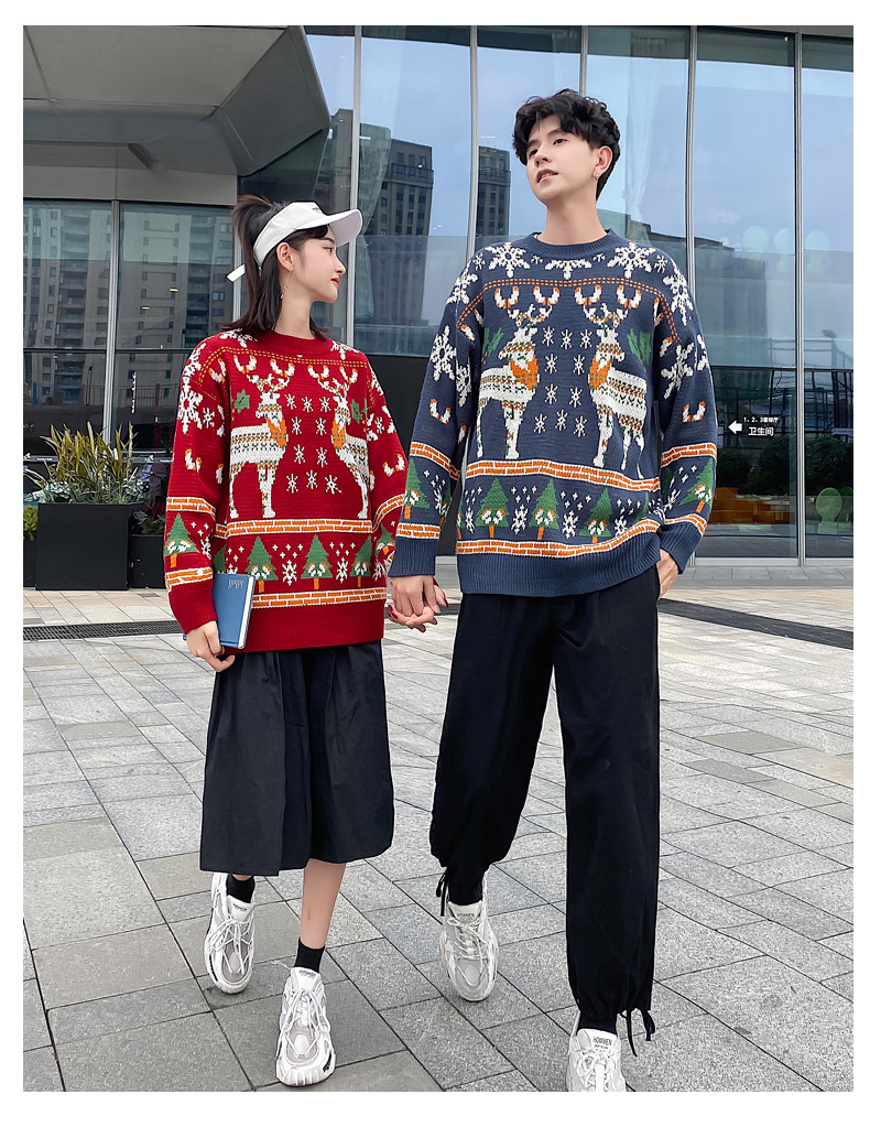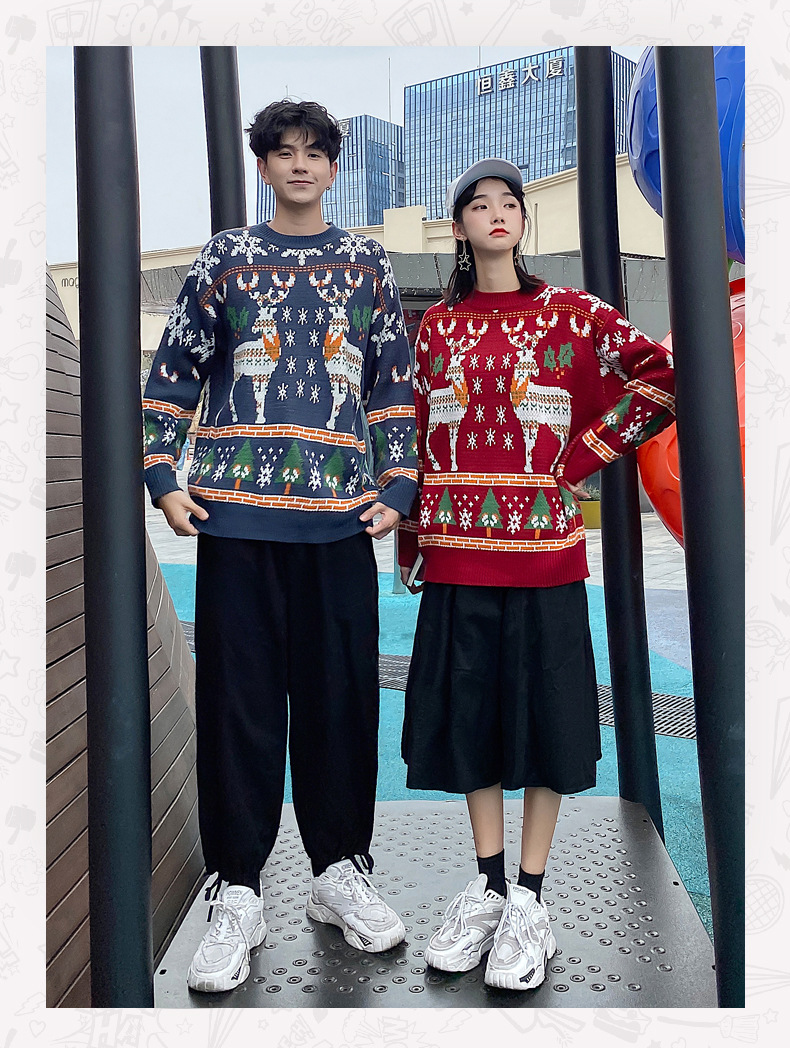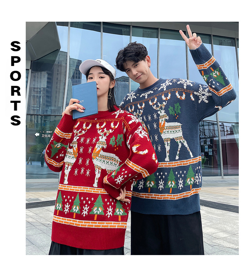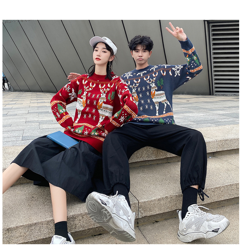 크리스마스 튀김 스트리트 크루넥 커플 의상 게으른 스타일 스웨터 엘크 겨울 슈퍼 인기 느슨한 한국 스타일 겉옷