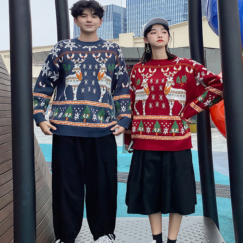 크리스마스 튀김 스트리트 크루넥 커플 의상 게으른 스타일 스웨터 엘크 겨울 슈퍼 인기 느슨한 한국 스타일 겉옷스토어 가기