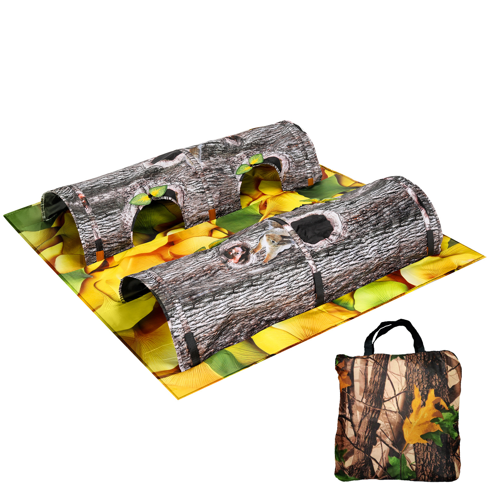 每只猫咪都是天生喜欢探索和捕猎,本产品完全满足捕猎能手的猫咪使用,此产品适合于任何品种大小类型的猫咪玩耍,产品采用仿真树纹颜色让产品整体视觉上更加真实美观,树木洞及树叶的搭配设计让猫咪感到更加真实,更加疯狂进行捕猎游戏,产品采用优质全新无毒的涤纶纤维布经得起猫咪大力抓磨及啃咬,宽大的洞口让猫咪自由灵活的穿梭玩耍,产品有5个孔位,方便多只猫咪共同玩耍追跑;轻质弹簧组合让产品更加方便收纳和折叠。产品室内外通用,方便折叠,可机洗。