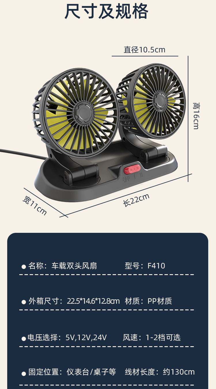 【产品名称】:车载双头风扇 【产品型号】:12206 【产品尺寸】:30*17 【产品材质】:ABS 【输入电压】:12V/24V 【输入电流】:2A 【产品功率】:10W(±20%) 【产品毛重】:4寸 580g 5寸660g 6寸880g 【产品包装】:牛皮纸盒包装/彩盒包装 【彩盒尺寸】:4寸27*11*12cm 5寸27*13*13cm 6寸35*15*14cm 【外箱入数】:4寸24pcs 5寸25pcs 6寸24pcs 【整箱重量】:4寸净15kg毛16kg 5寸毛16.5kg 6寸净20kg毛21kg 【适合车型】:基本通用型 【产品特点】:3档调速,双头摇头,噪音小,寿命长