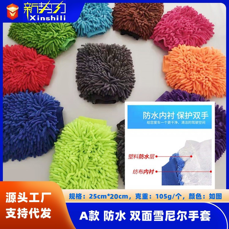 产品名称:大号防水双面雪尼尔(大号擦车手套 家居清洁手套) 内有防水膜加内衬。