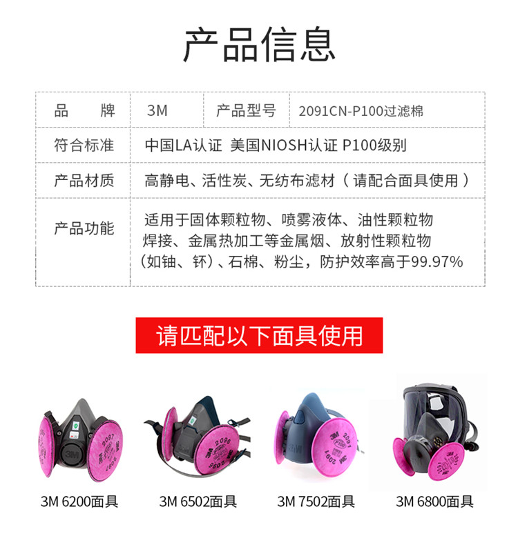 3M2091CN 필터면 6200/7502 하프 마스크 P100 미립자 물질 고효율 먼지 필터면 2/봉투스토어 가기