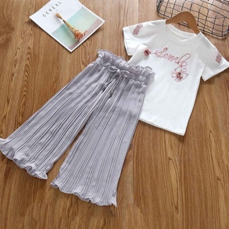 5981 재고 아동 여아 새로운 유행 여름 큰 어린이 인터넷 연예인 쉬폰 와이드 레그 팬츠 투피스 세트