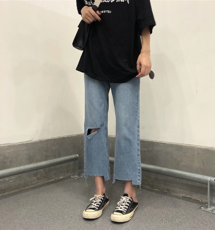 뚱뚱한 자매 여름 2021 새로운 플러스 사이즈 찢어진 청바지 여자의 느슨한 슬리밍 하이 웨이스트 스트레이트 바지 와이드 레그 바지스토어 가기