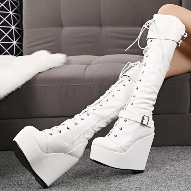 Wish 크로스 국경 대외 무역 플러스 사이즈 여성용 가죽 부츠 유럽, 미국 및 영국 벨트 버클 크로스 스트랩 두꺼운 하단 웨지 힐 하이 부츠