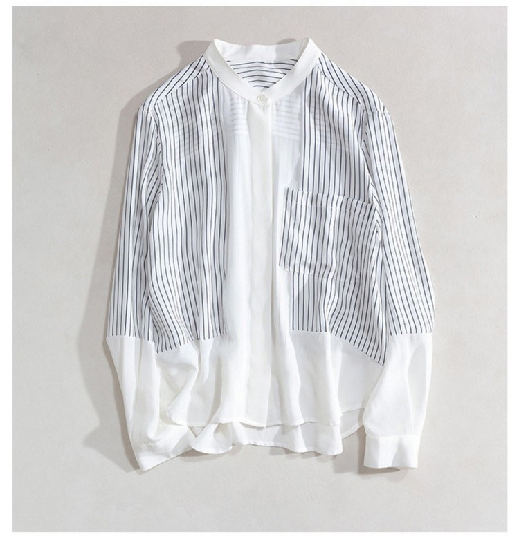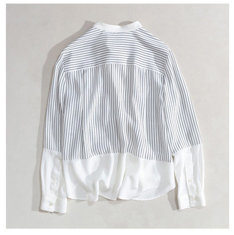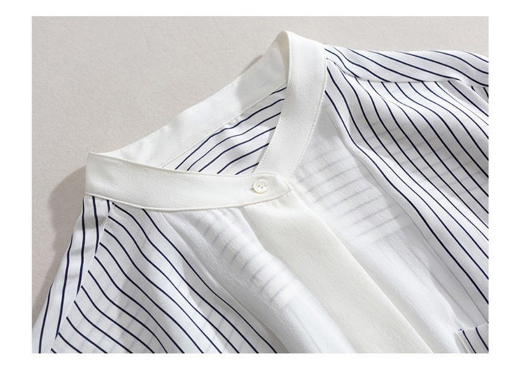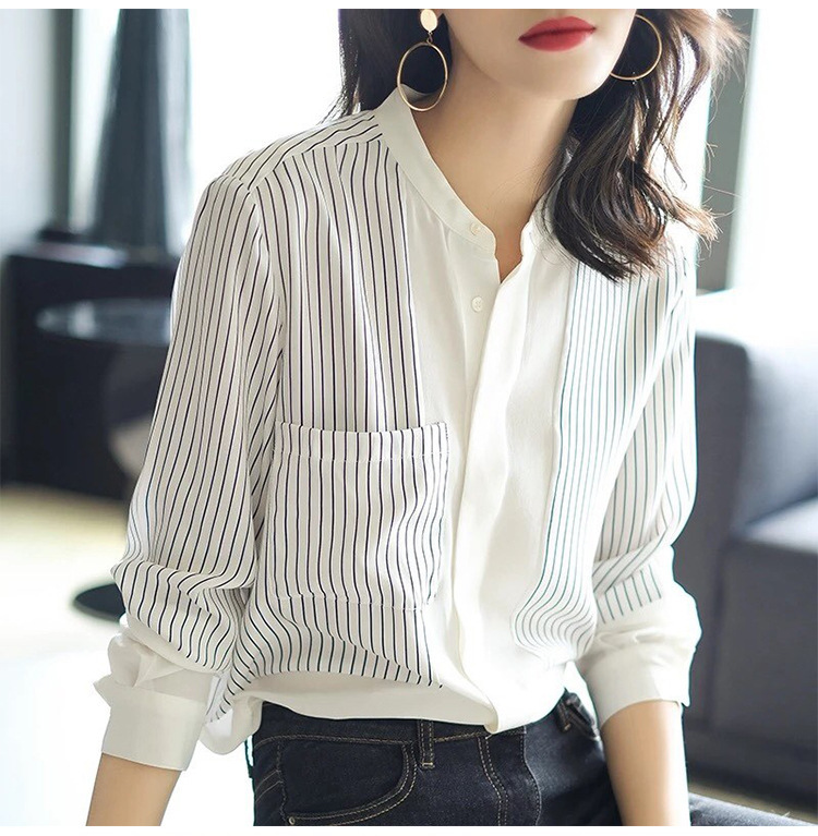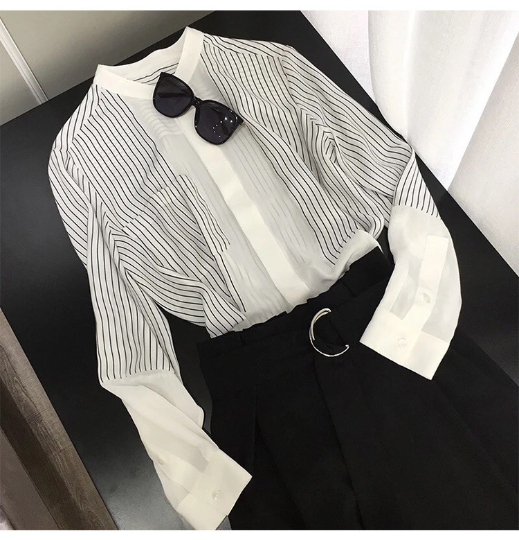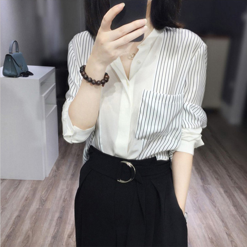 사전 판매 봄과 여름 새로운 느슨한 쉬폰 셔츠 여성의 세련된 우아한 줄무늬 V 넥 긴팔 전문 최고 트렌디스토어 가기