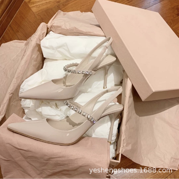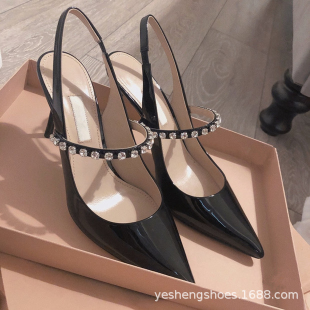 여성용 하이힐 2024 봄 여름 신상품, 라인스톤 장식의 뾰족코 샌들, 얇은 굽, 뒤가 빈 디자인스토어 가기