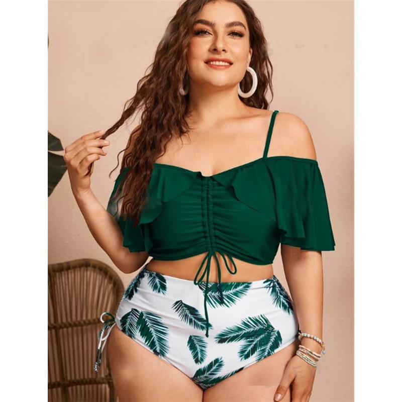 유럽과 미국의 대외 무역 새로운 분할 대형 서랍 러플 비키니 오프 숄더 스트랩 여성을위한 높은 허리 수영복