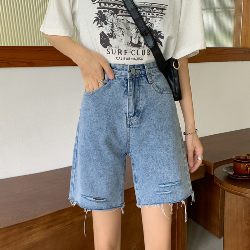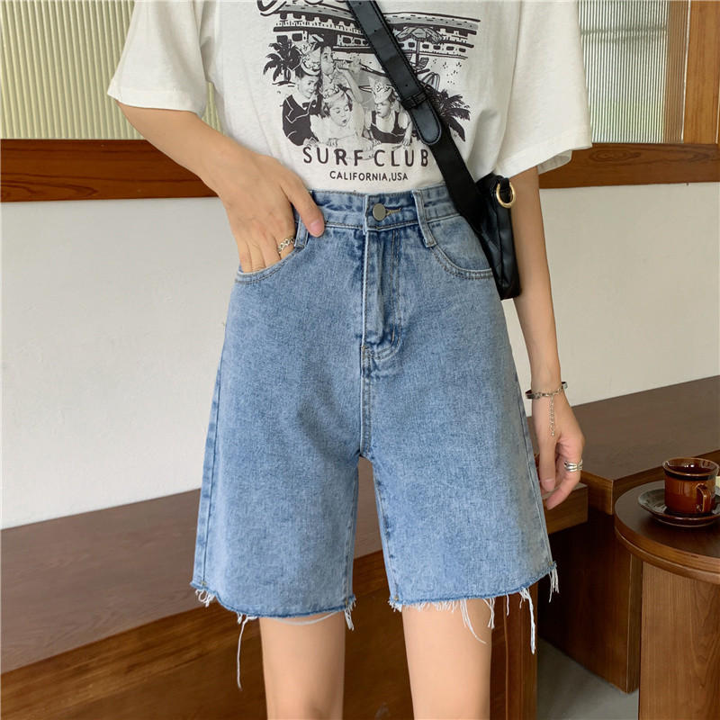 빈티지 홍콩 스타일 5 점 데님 반바지 여자의 여름 2021 느슨한 스트레이트 튜브 학생 하이 웨이스트 슬리밍 와이드 레그 미들 팬츠스토어 가기