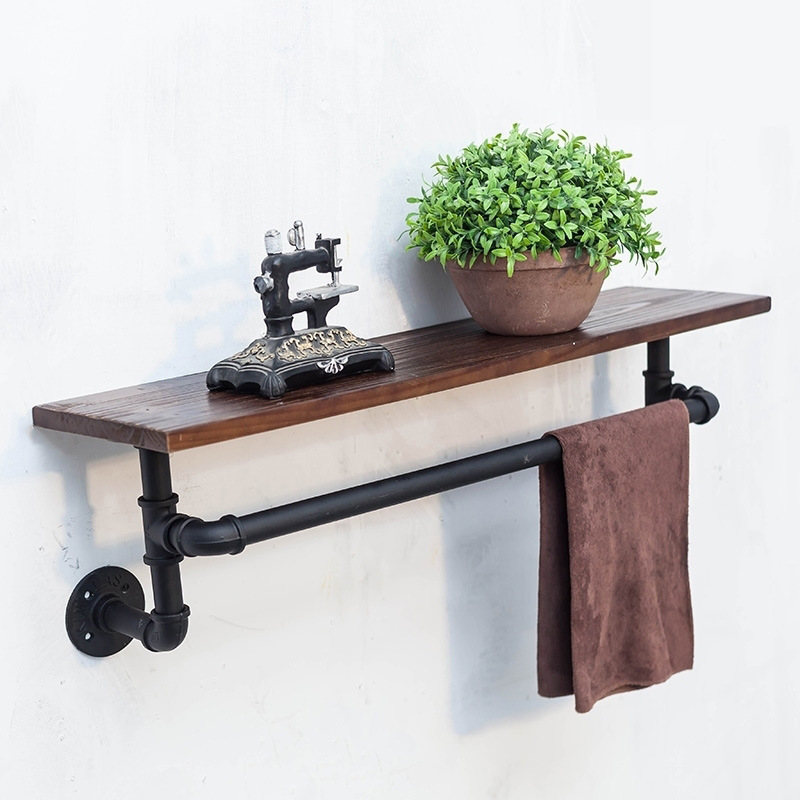 간단한 철 보관 랙 빈티지 물 파이프 스타일 장식 벽 걸이 벽 단단한 나무 수건 걸이 철 보관 랙