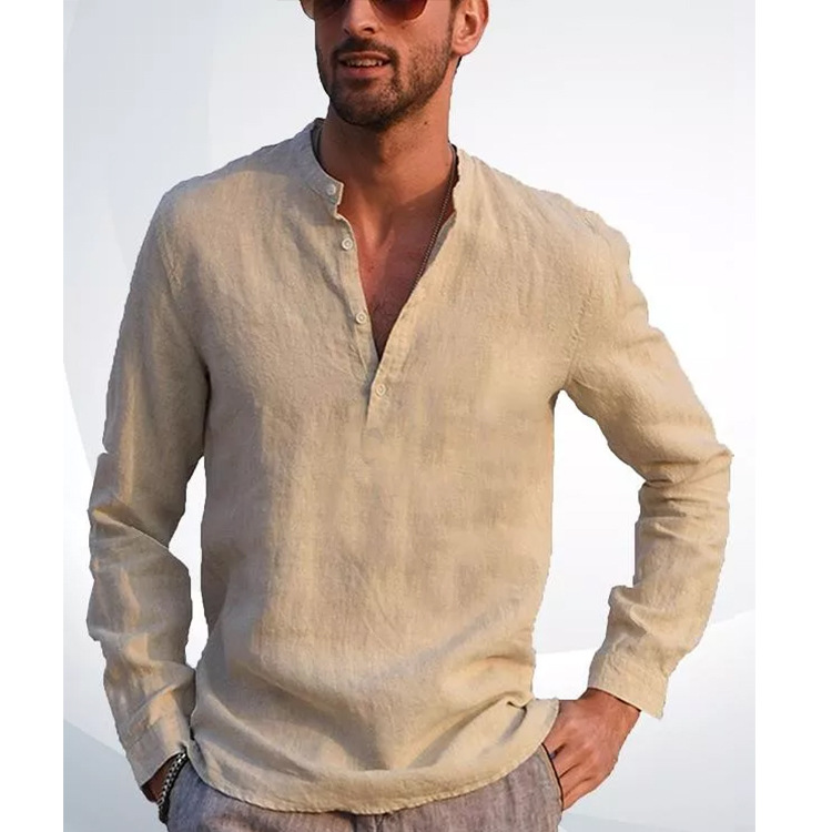 2021 AliExpress는 Amazon 유럽과 미국 남성의 긴 소매 V-neck 캐주얼 비치 린넨 셔츠 남성복을 기원합니다.