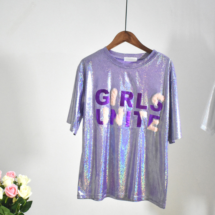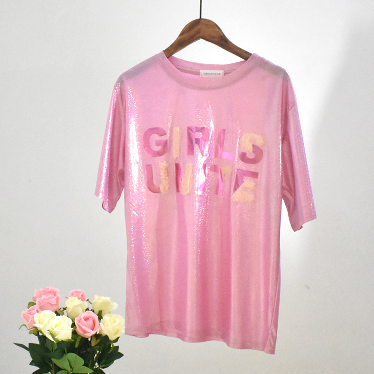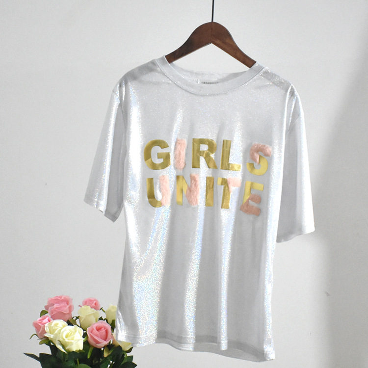 반짝이는 실크 프린트 레터링 루즈핏 반팔 티셔츠 여성 여름 2025 신상 학생 반짝이 반팔 여성복