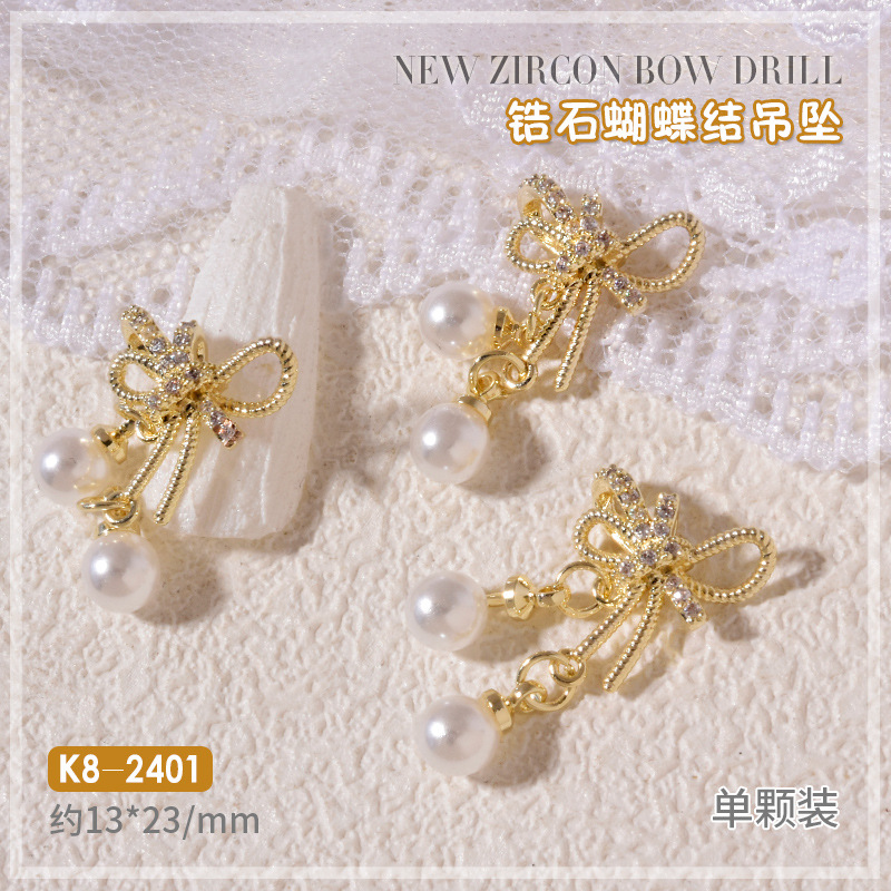 2023 새로운 네일 아트 지르콘 보석 활 진주 사랑 펜던트 인터넷 빨간 나비 색상 보존 네일 장식 드릴
