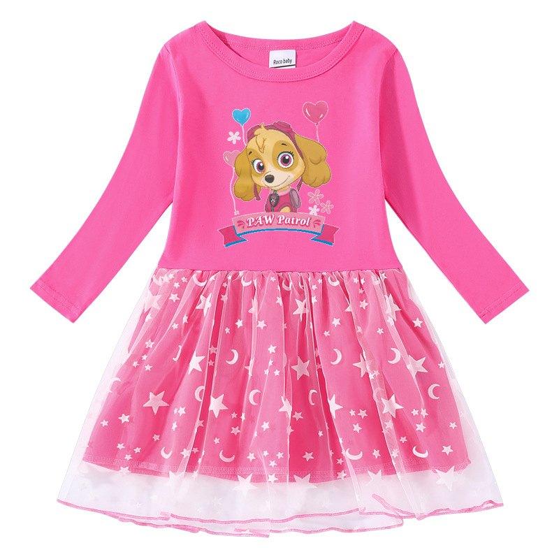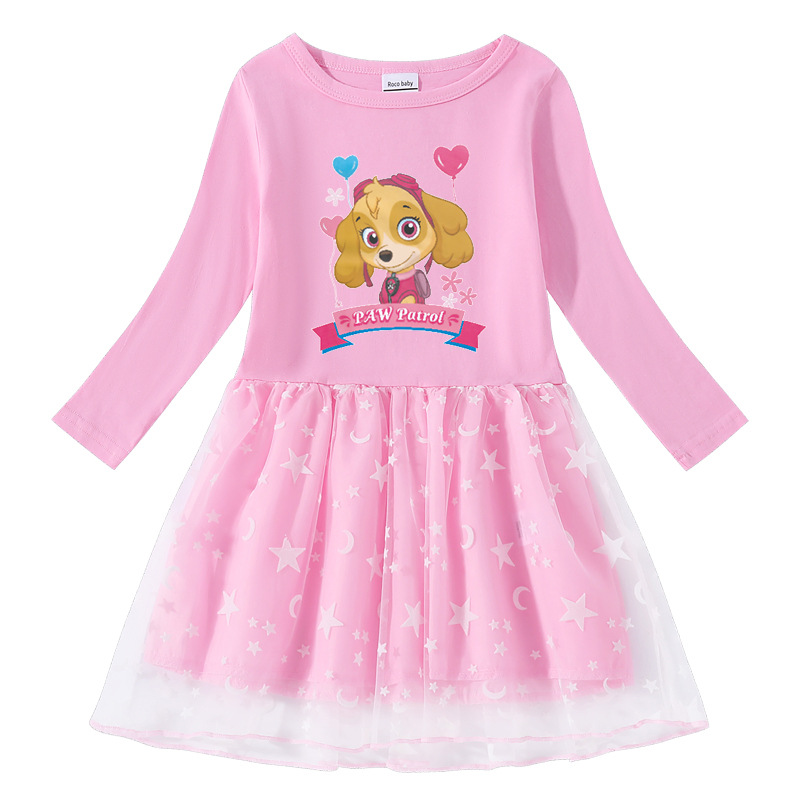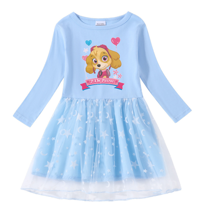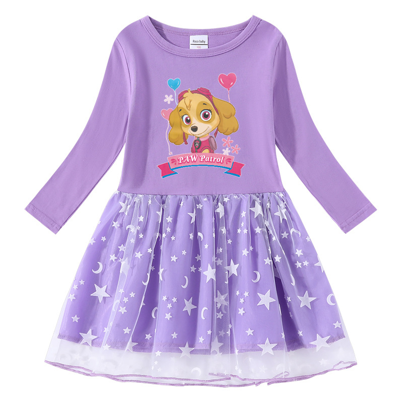 2023 봄과 가을 새로운 크로스 보더 소녀 원피스 면 인쇄 만화 스타 문 메쉬 긴 소매 공주 원피스