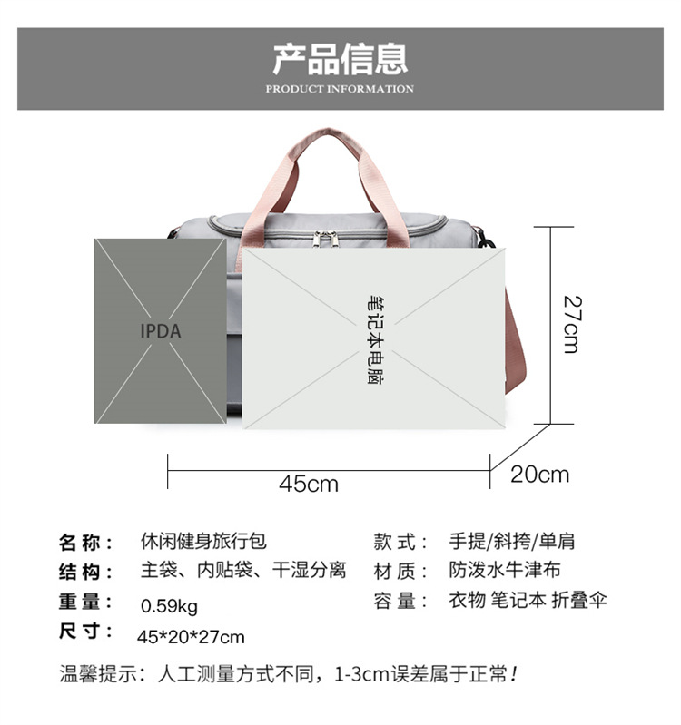 야외 스포츠 피트니스 방수 남성 및 여성 트레이닝 수영 가방 대각선 건식 및 습식 분리 단거리 패션 여행 가방 신발 수납 공간