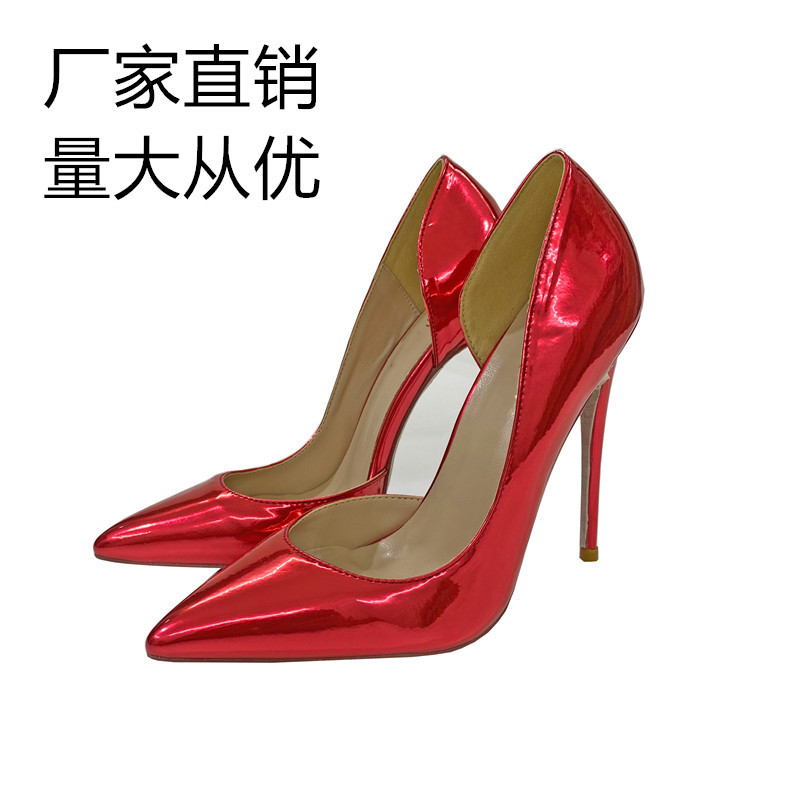 국경 간 무역 도매 빨강 특허 가죽 옆 빈 하이힐 12cm 뾰족한 스틸레토 힐 얕은 입 신발 부드러운 가죽 여성 신발스토어 가기