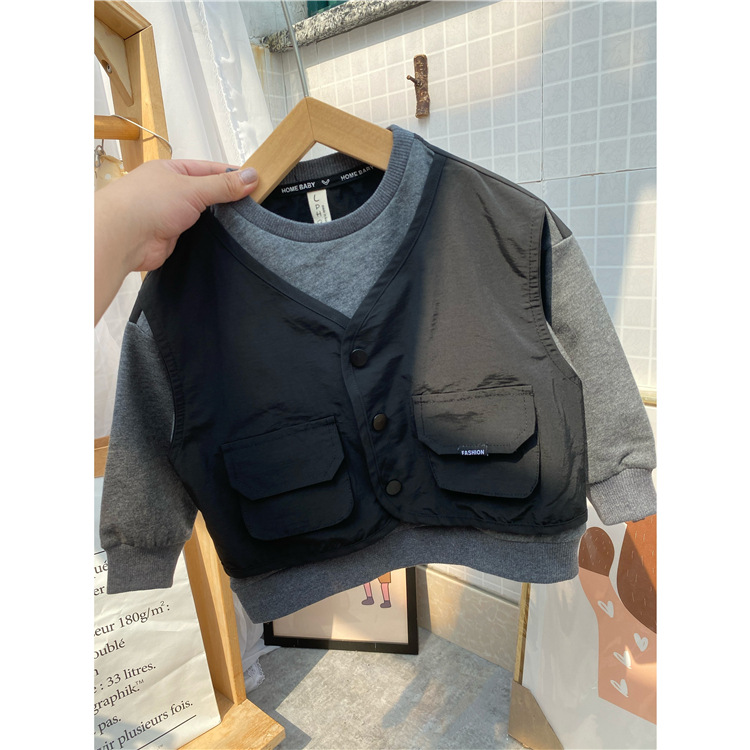 2021 한국 가을 새로운 아동복 소년과 소녀 잘 생긴 가짜 투피스 스티치 조끼 스웨터 승무원 넥 재킷 조수스토어 가기