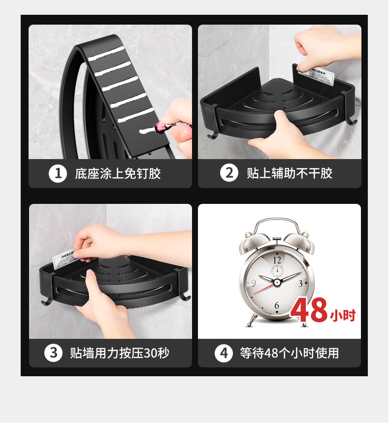 (2)安装请注意,墙面需平整坚固的玻璃瓷砖等。不可用在粉刷墙,墙纸,石灰墙等不平整不坚固的墙面上。涂胶上墙后需等待3-5天,免钉胶完全干透再使用!