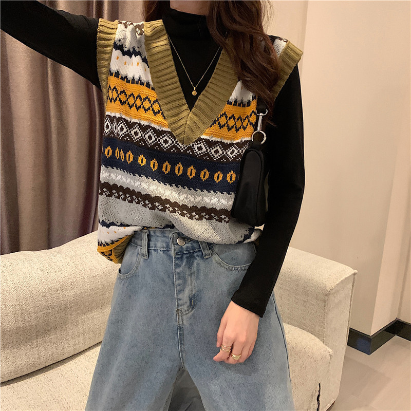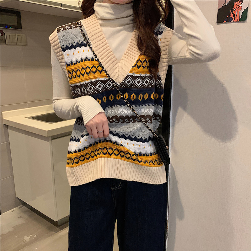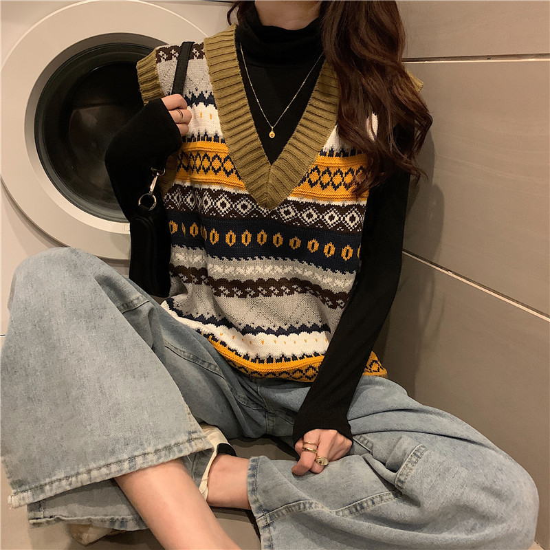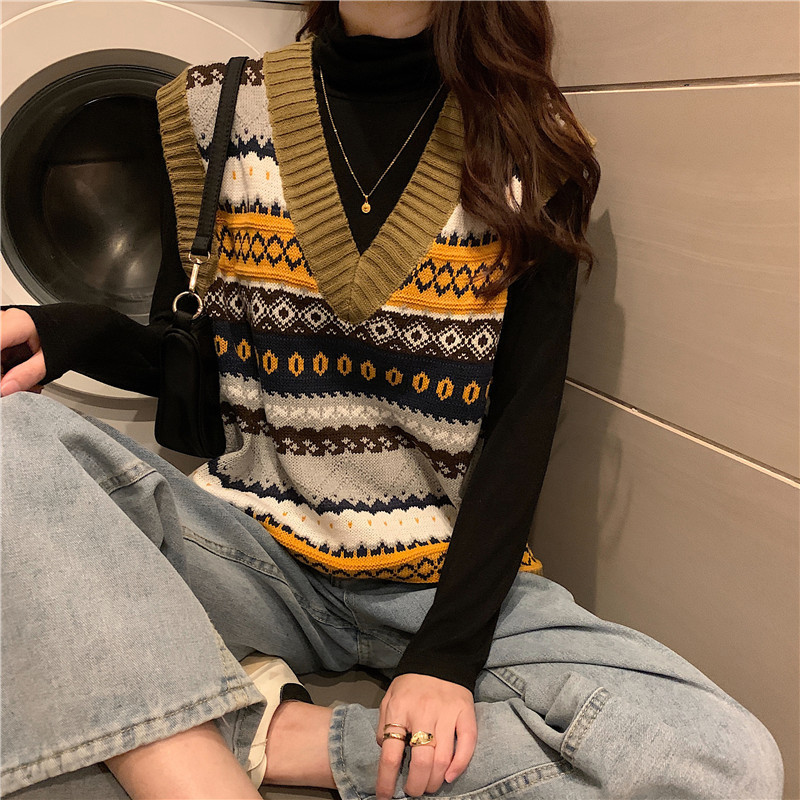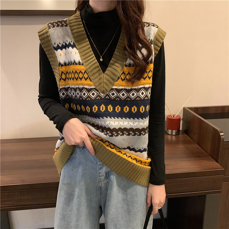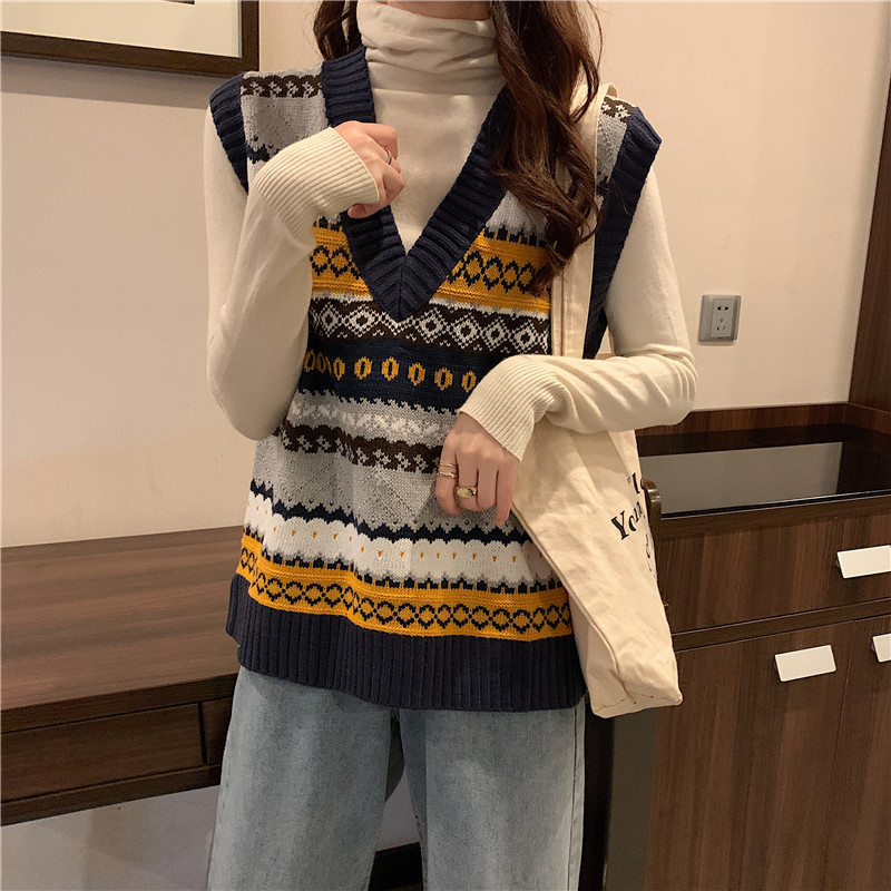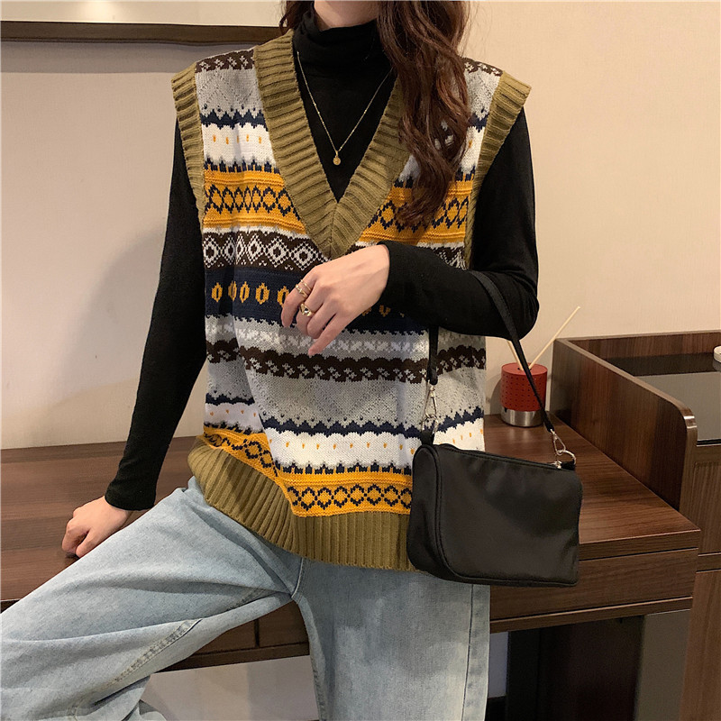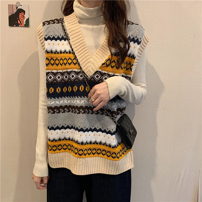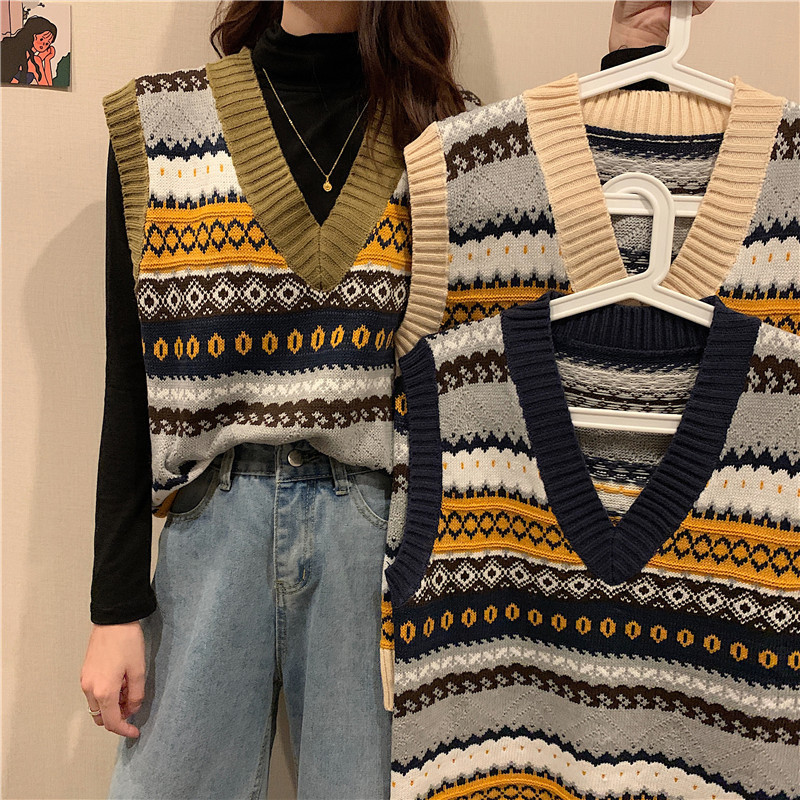 실제 가격 스트라이프 컬러 매칭 V-넥 조끼 스웨터 조끼 여자의 인터넷 연예인 느슨한 니트 조끼 겉옷 재킷스토어 가기