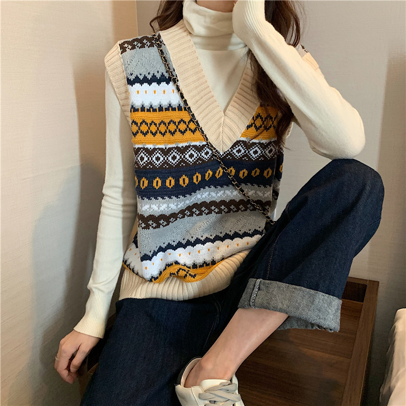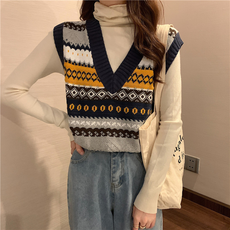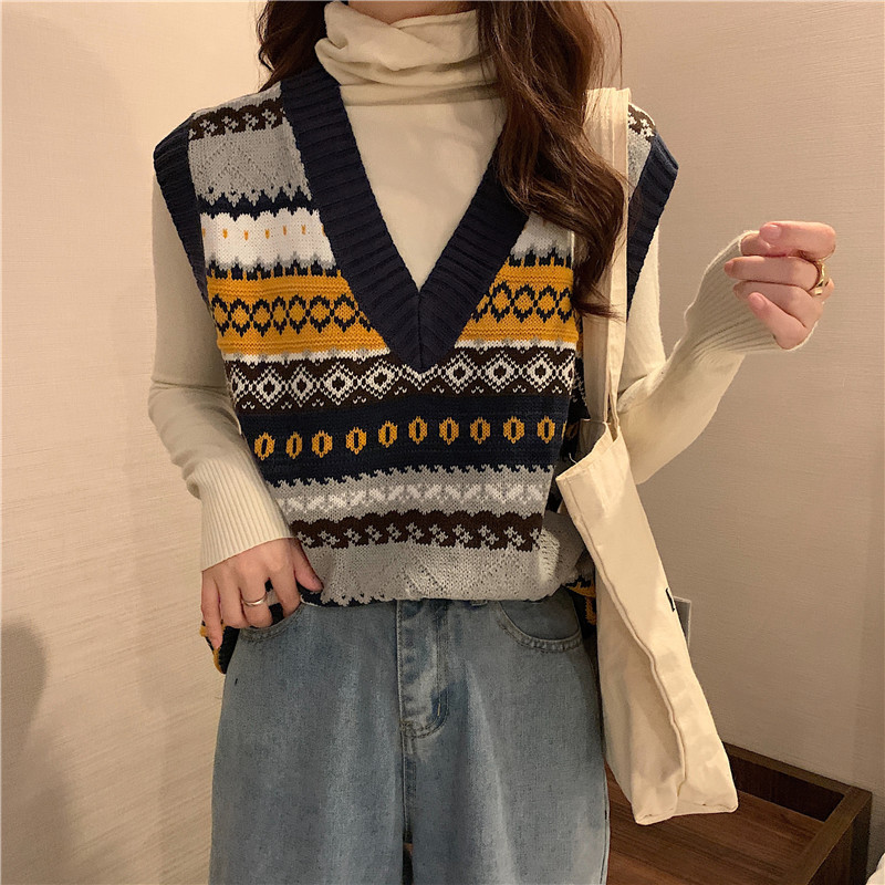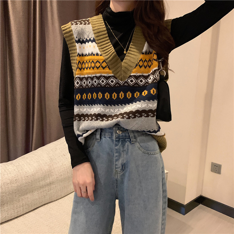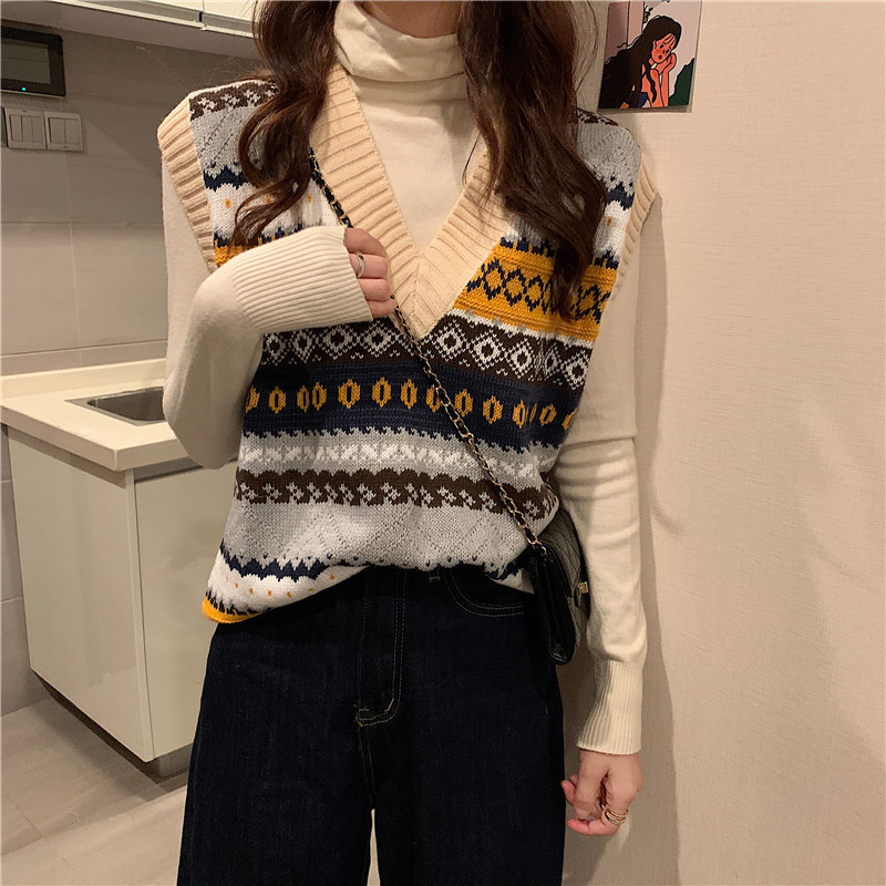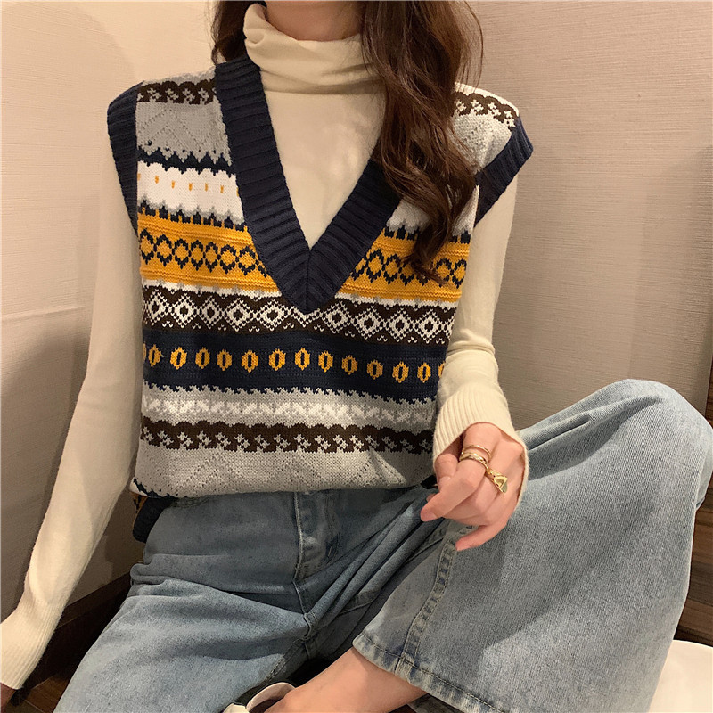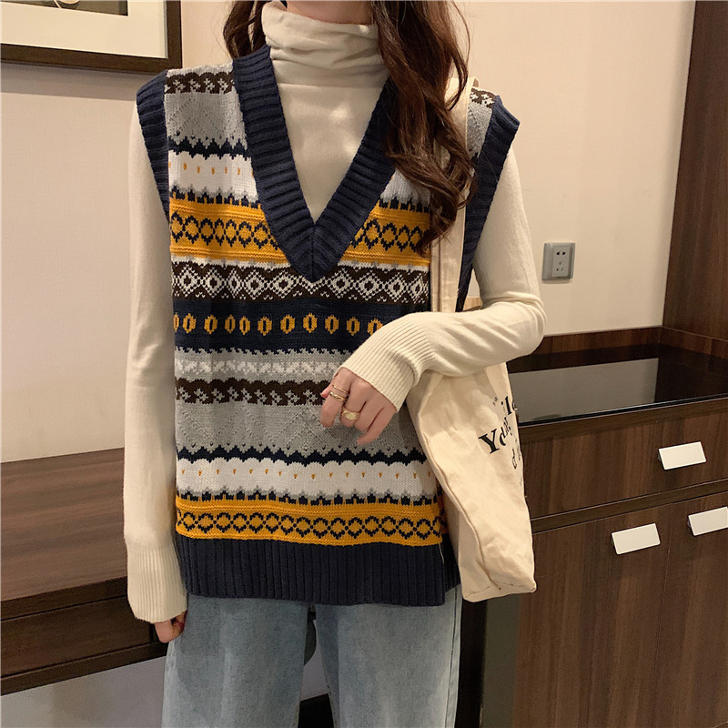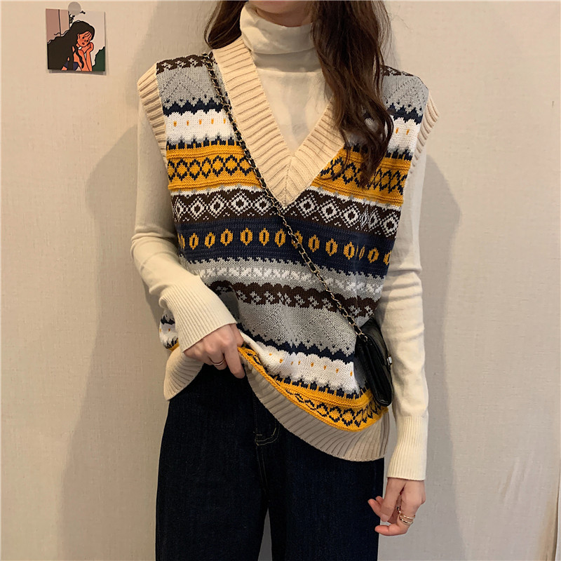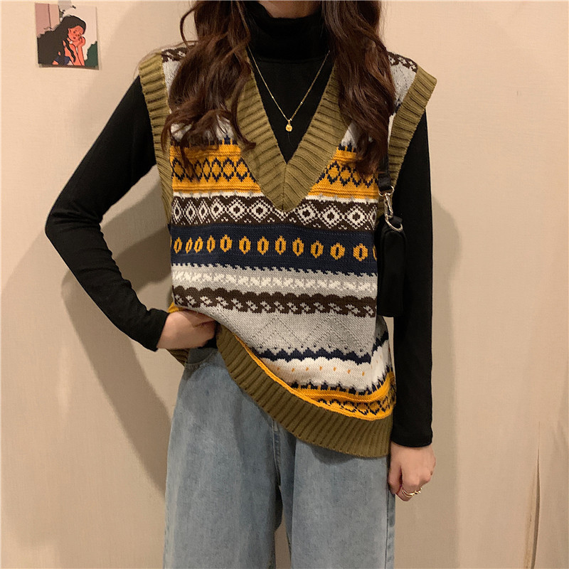 실제 가격 스트라이프 컬러 매칭 V-넥 조끼 스웨터 조끼 여자의 인터넷 연예인 느슨한 니트 조끼 겉옷 재킷스토어 가기