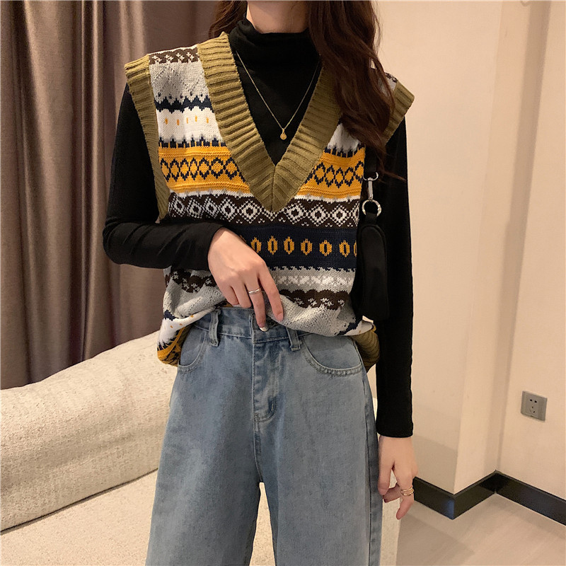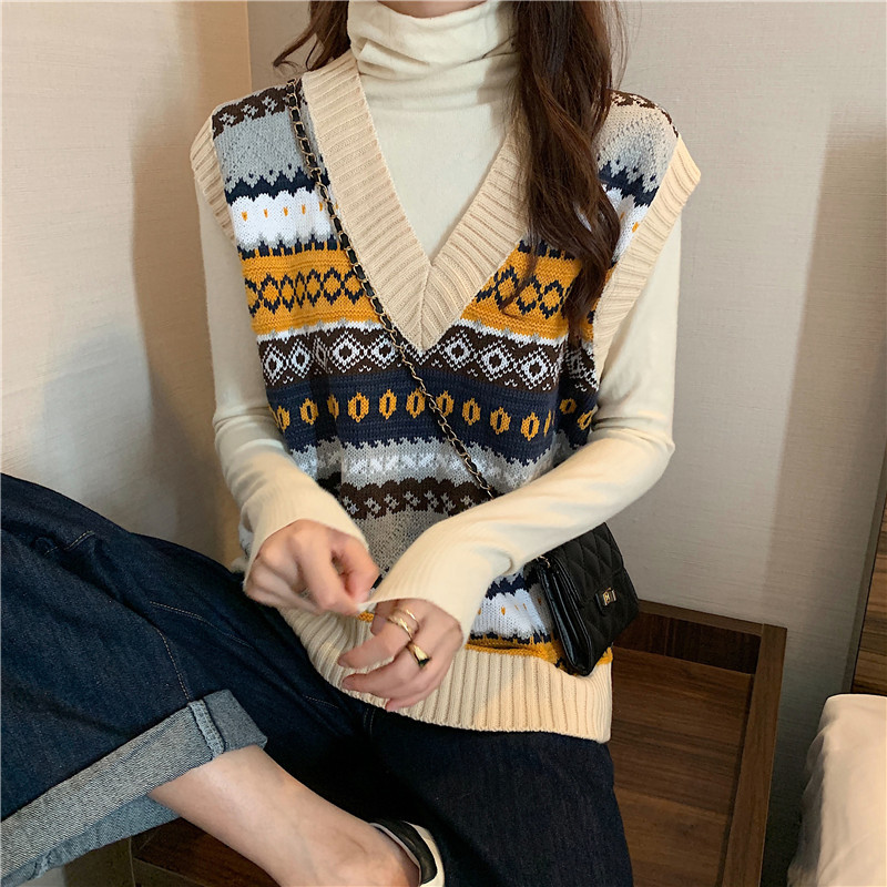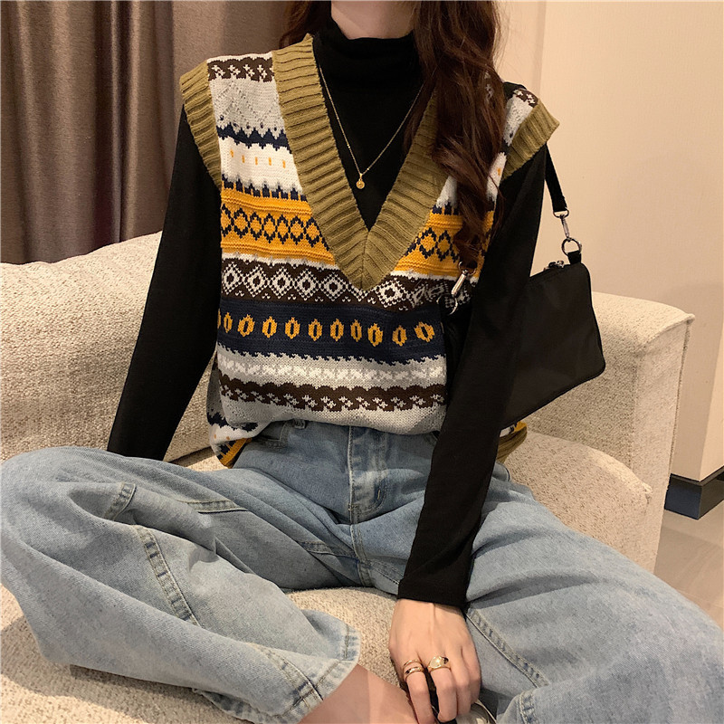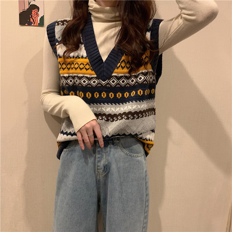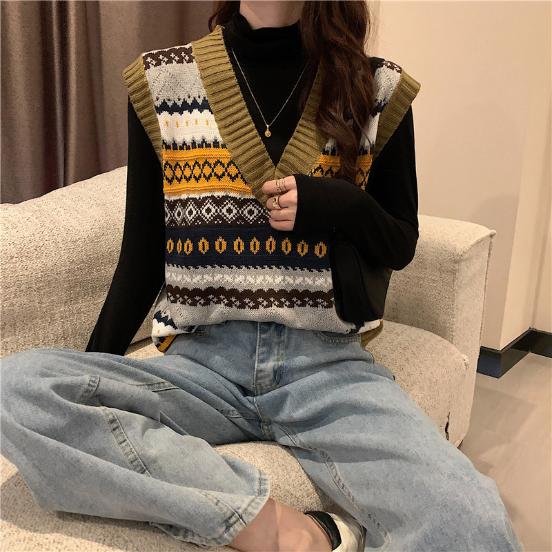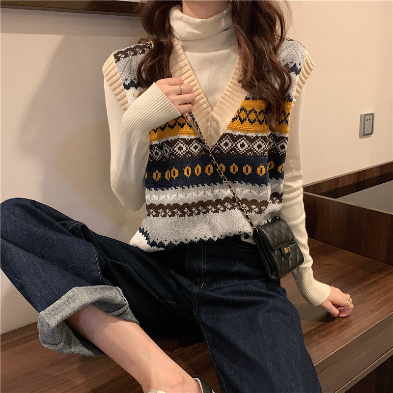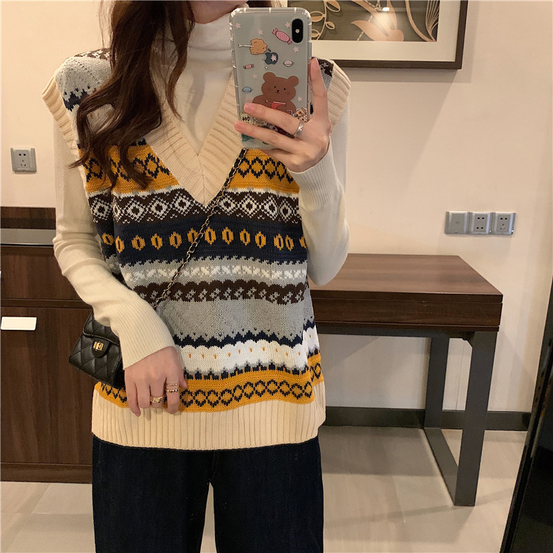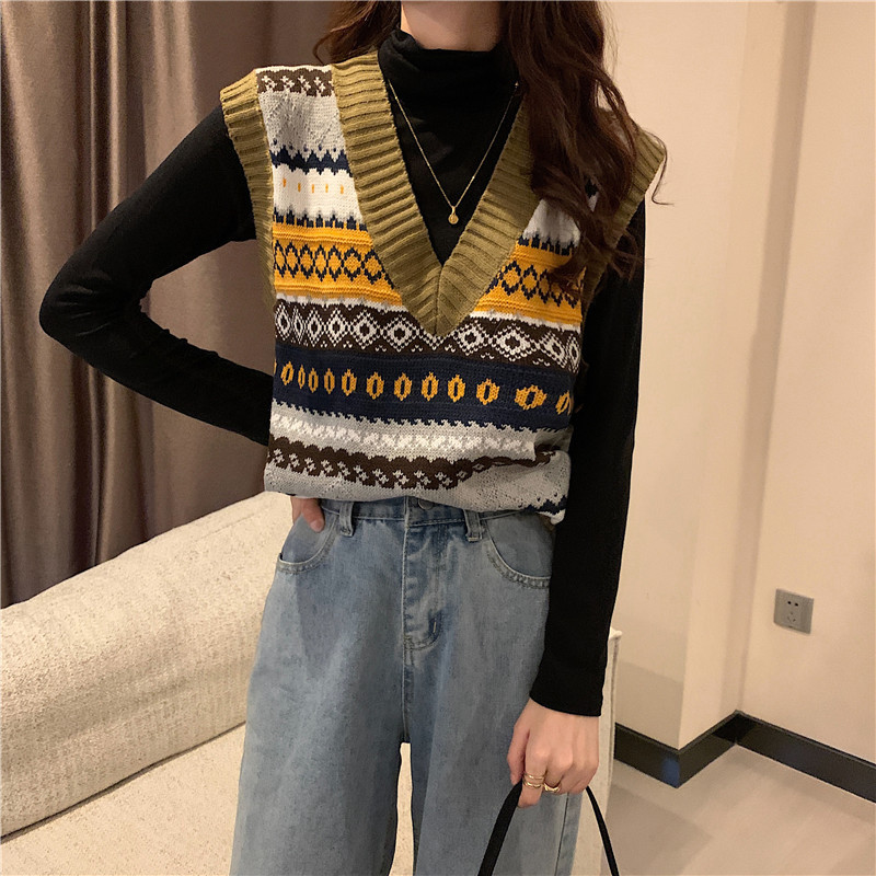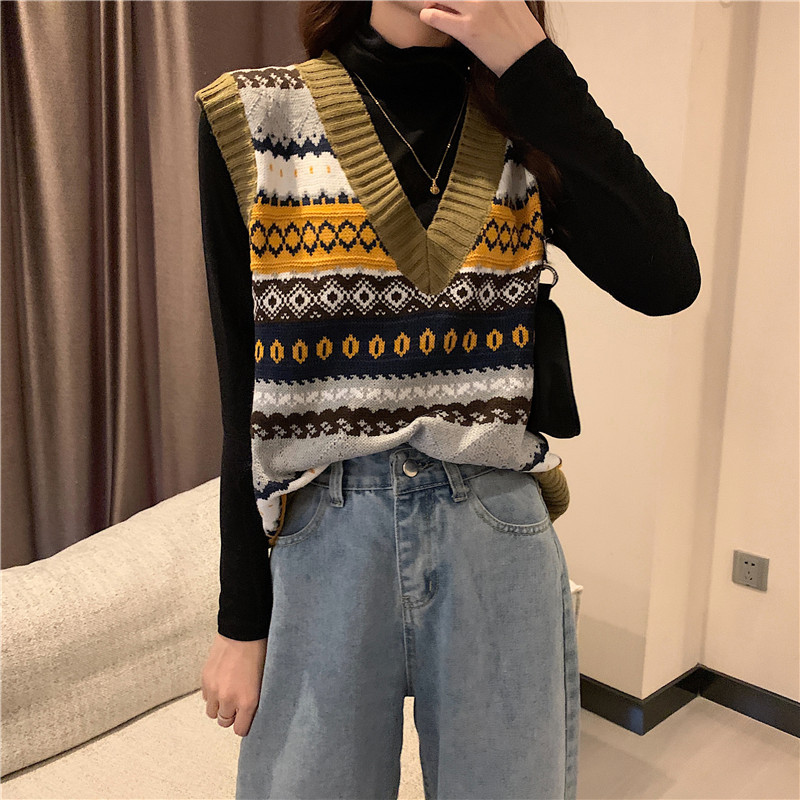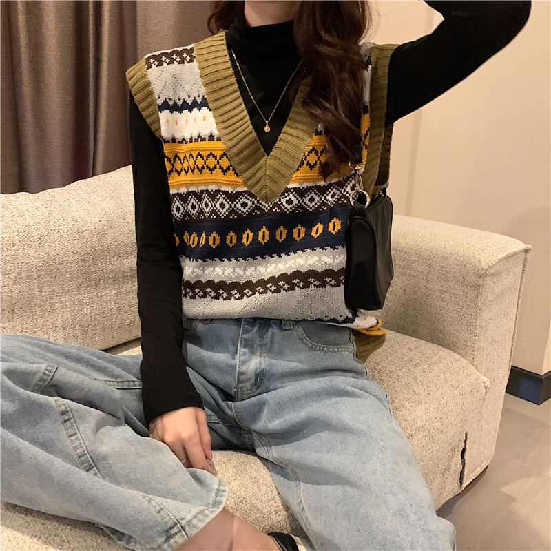 실제 가격 스트라이프 컬러 매칭 V-넥 조끼 스웨터 조끼 여자의 인터넷 연예인 느슨한 니트 조끼 겉옷 재킷스토어 가기