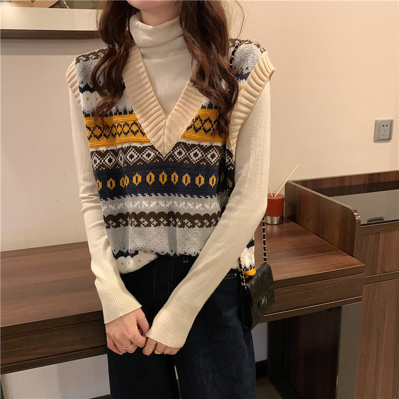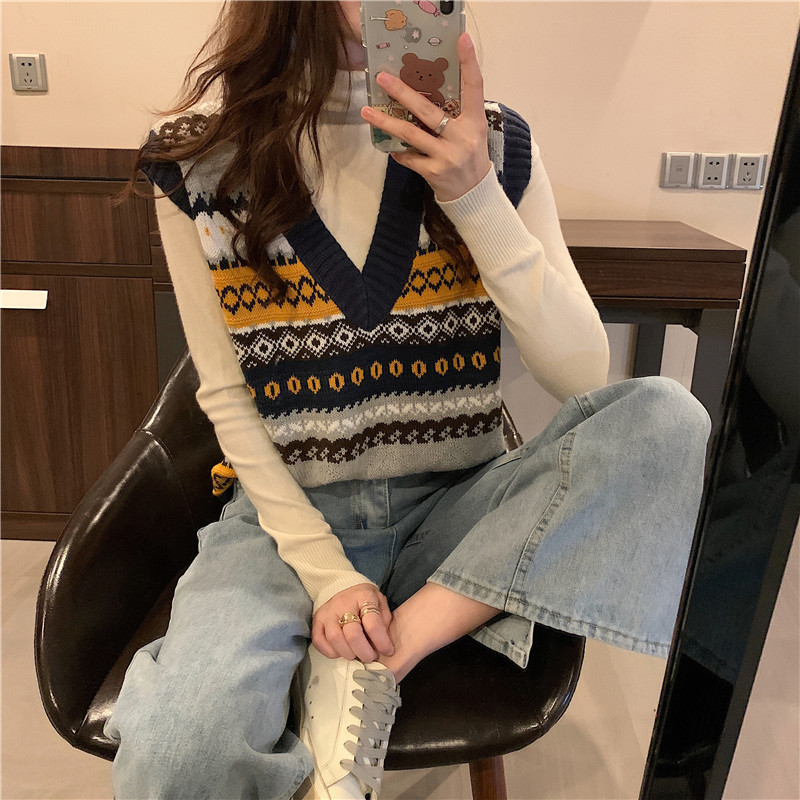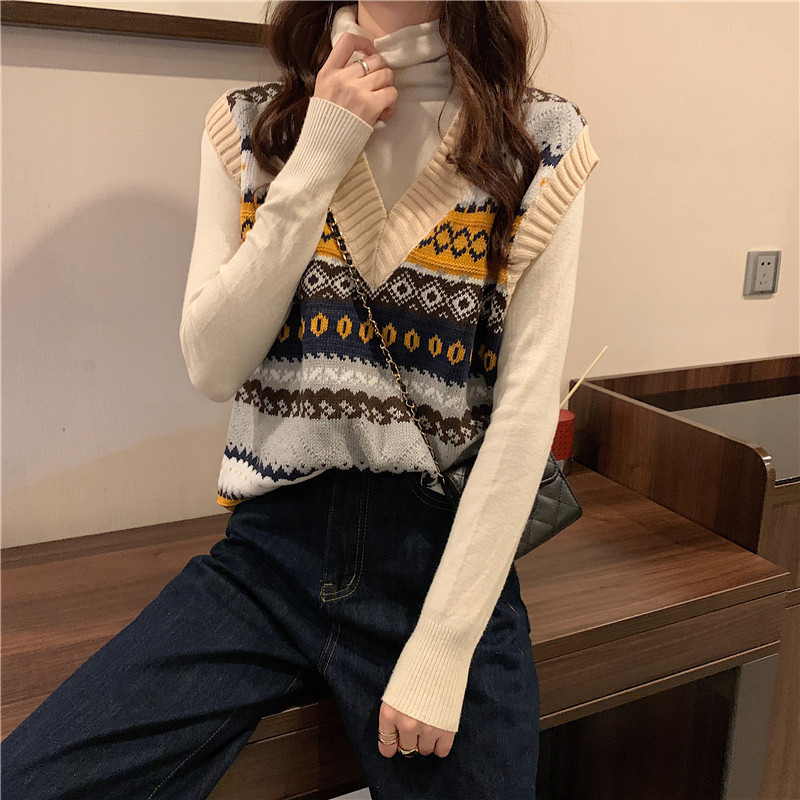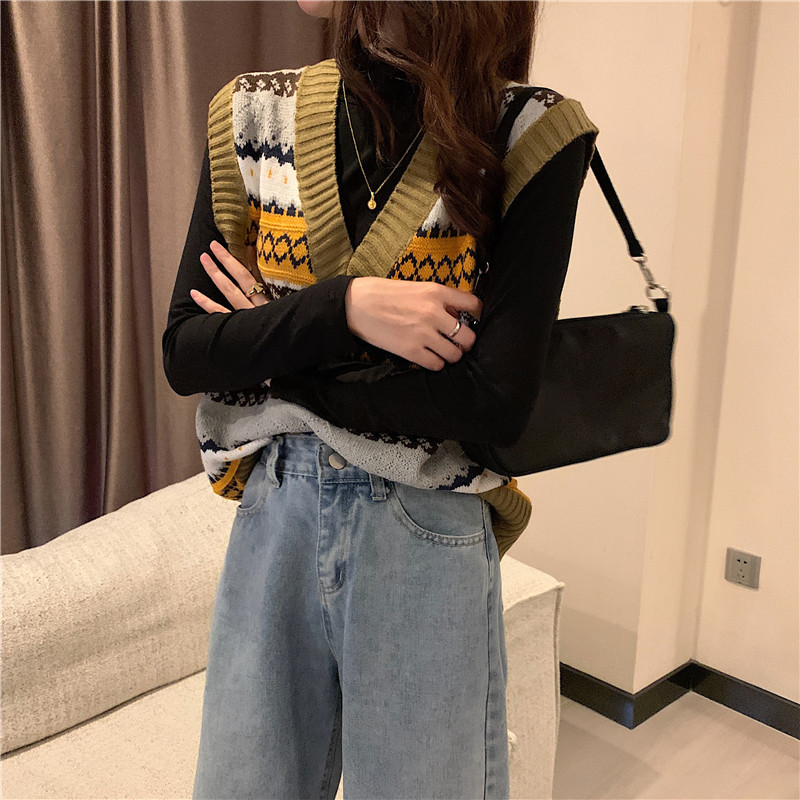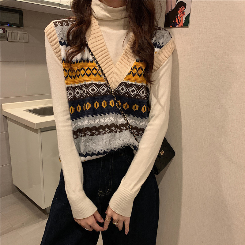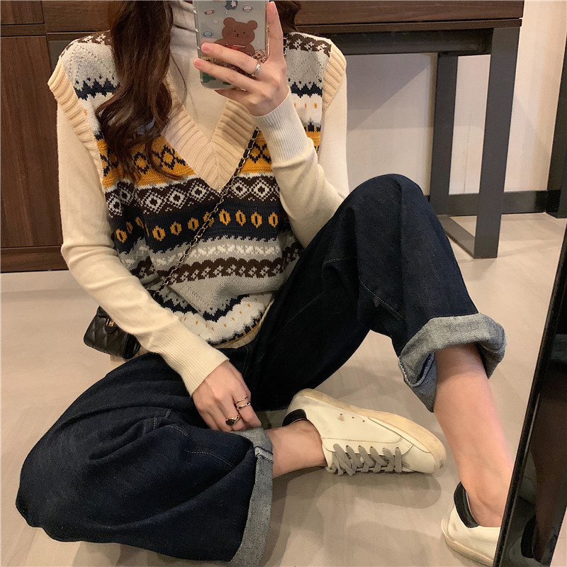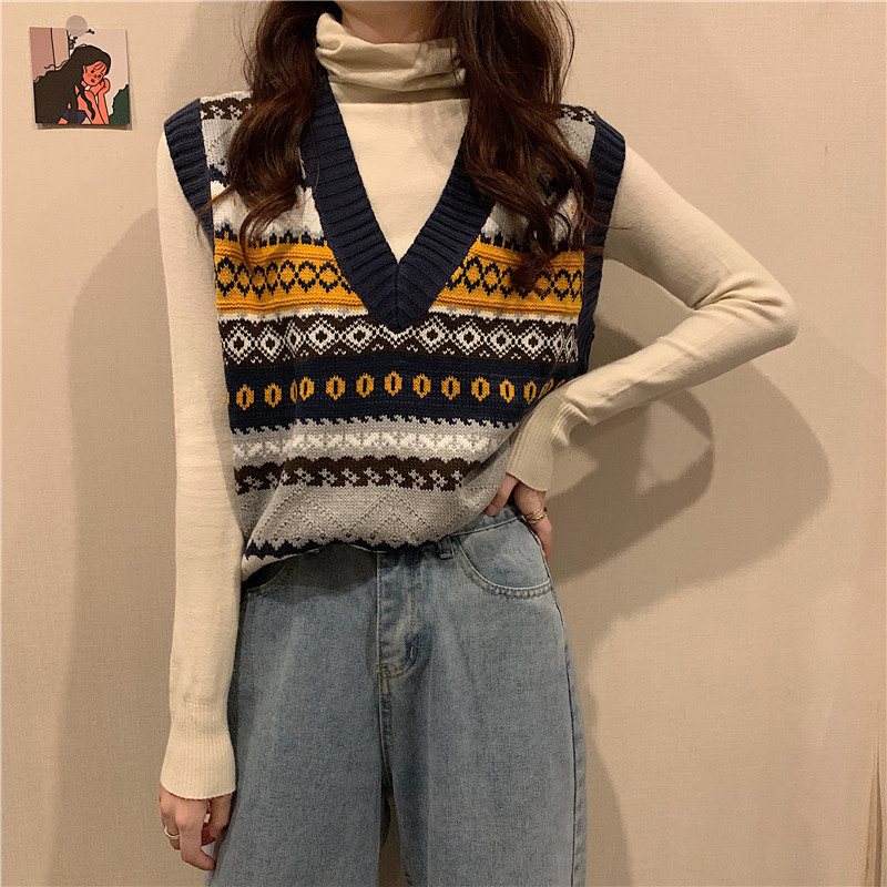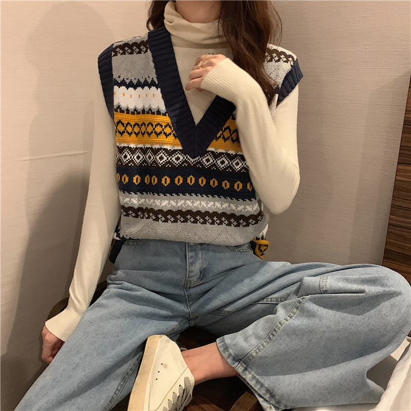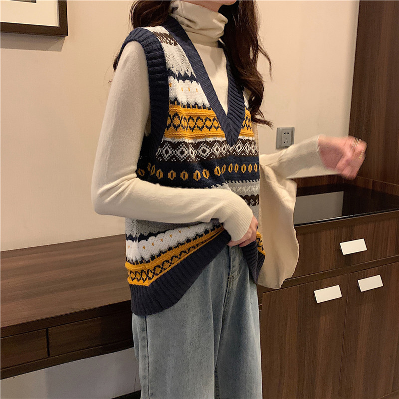 실제 가격 스트라이프 컬러 매칭 V-넥 조끼 스웨터 조끼 여자의 인터넷 연예인 느슨한 니트 조끼 겉옷 재킷스토어 가기