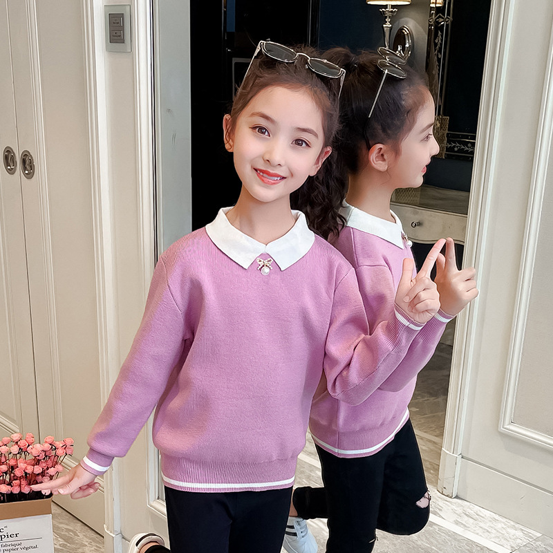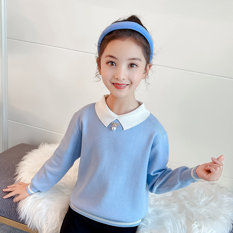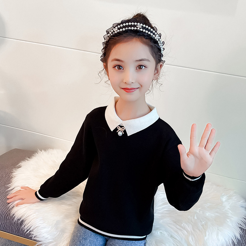 여아 스웨터 2023 가을 새로운 어린이 진주 스퀘어 칼라 아카데미 스타일 니트 스웨터 어린이 긴 소매 탑 트렌디스토어 가기
