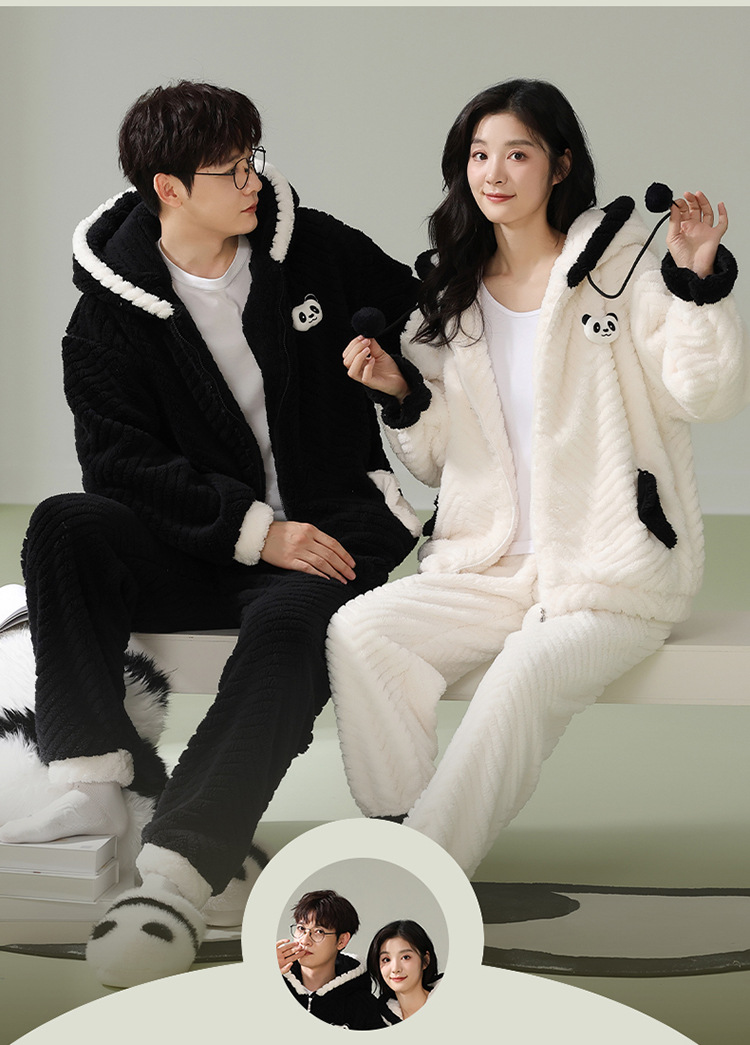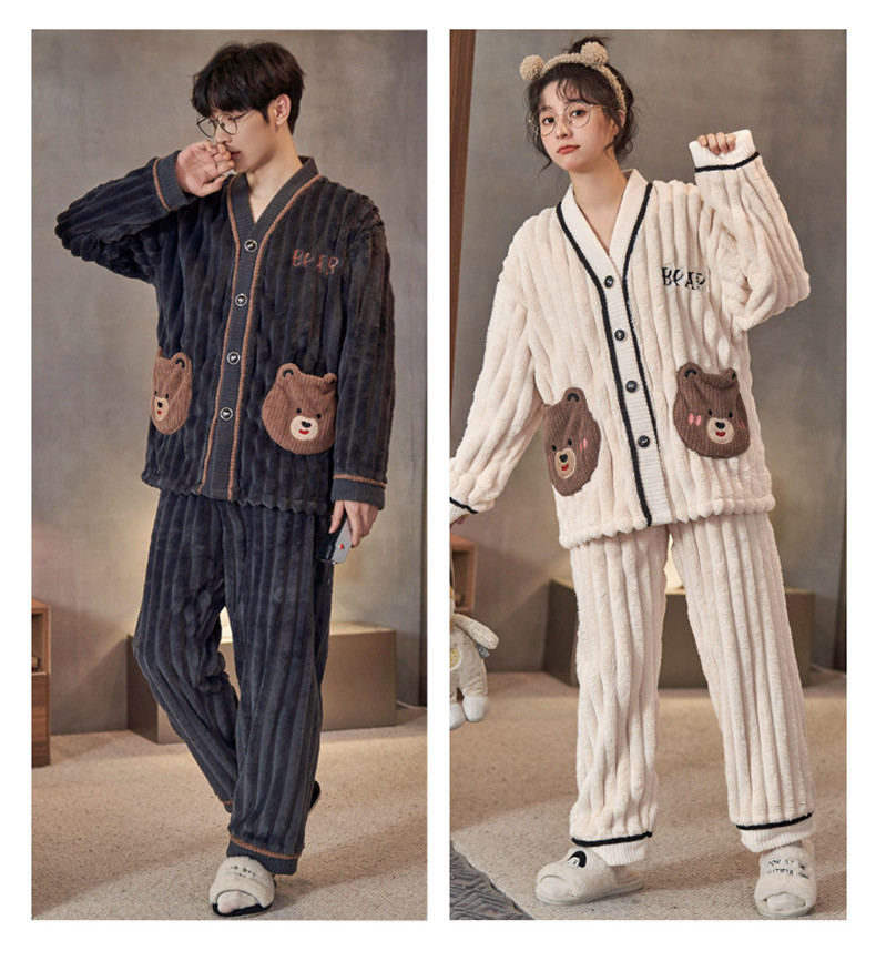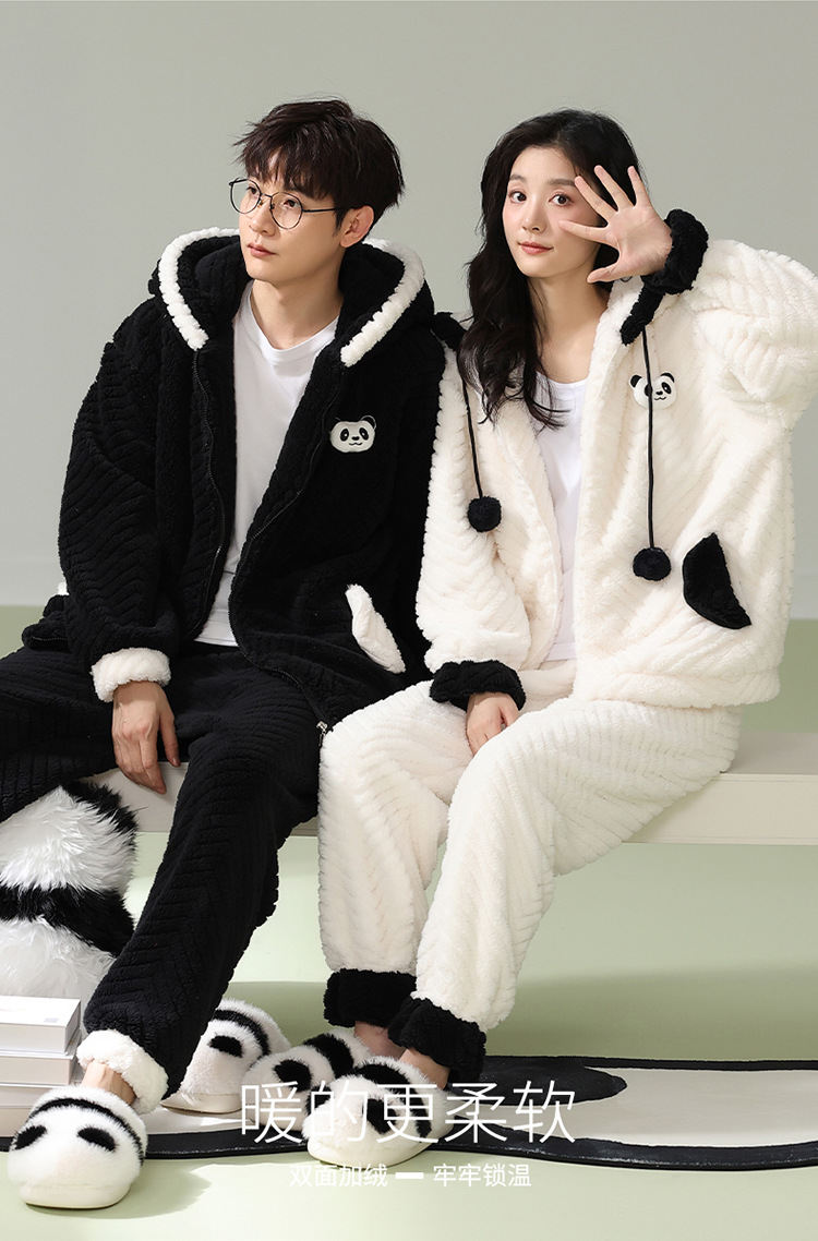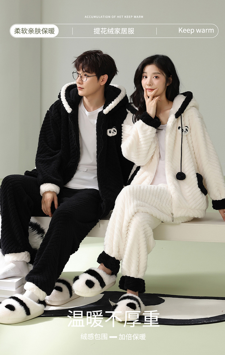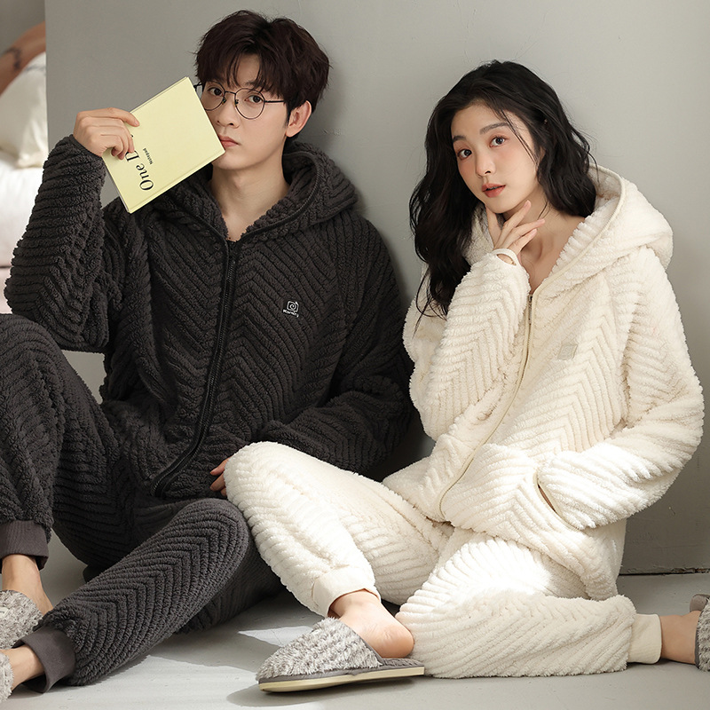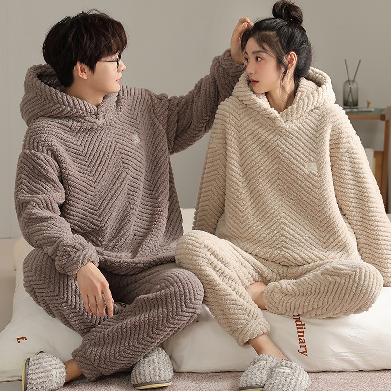 춘 바이펜 커플 잠옷 가을과 겨울 산호 양털 남성과 여성의 두꺼운 기모 플란넬 후드 겨울스토어 가기