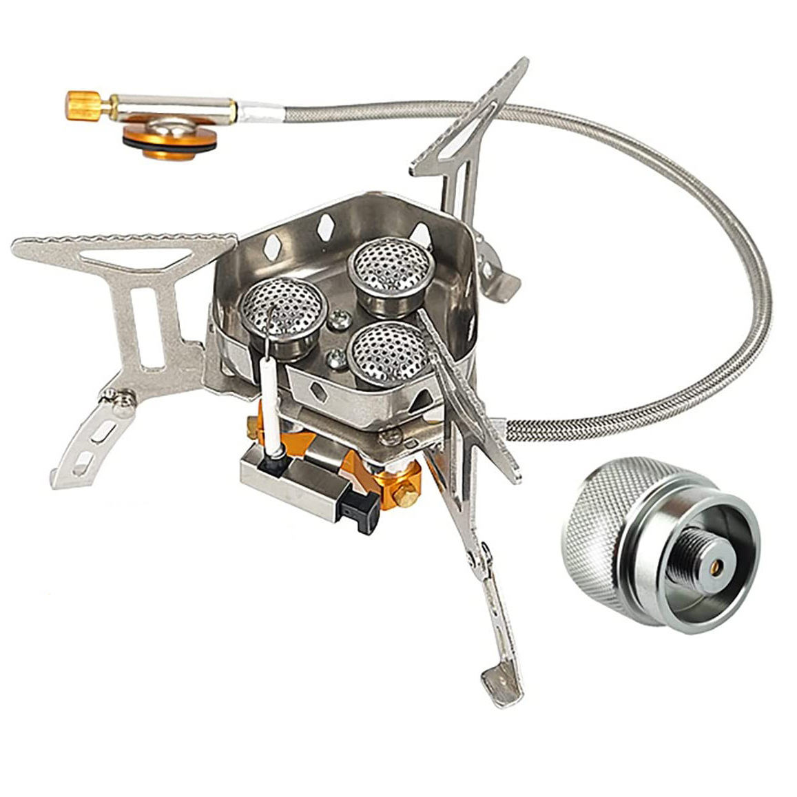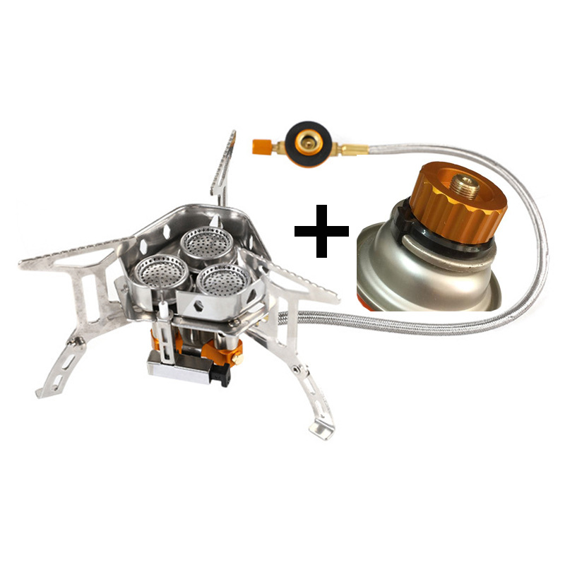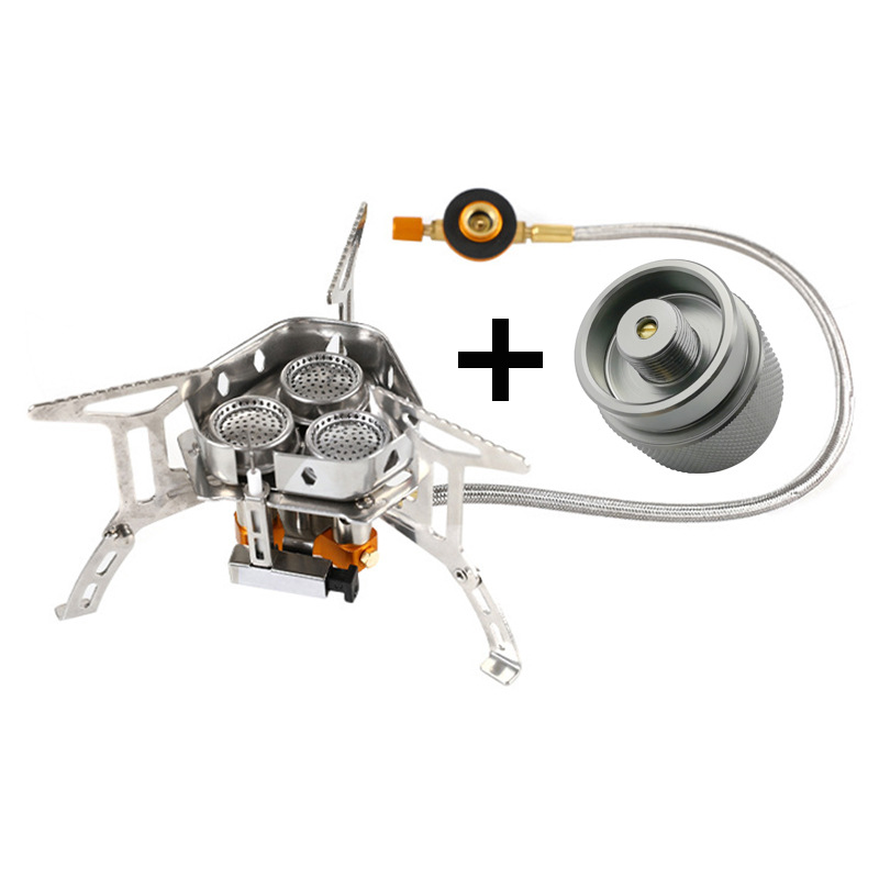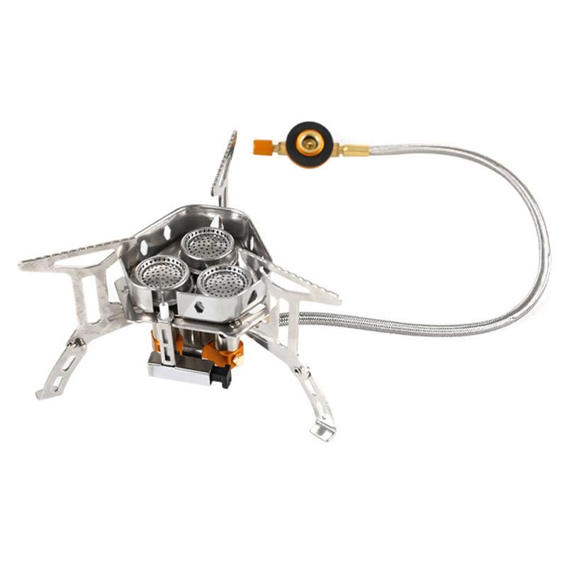 材质为不锈钢材质,承重力强。体积小,可折叠式支撑架,耐高温。高能量陶瓷压电打火系统,确保点火成功。三头设计,供热均匀,蜂窝火焰,聚火焰增加氧气流通提高燃烧使用率,通用性好,适合各类气罐。