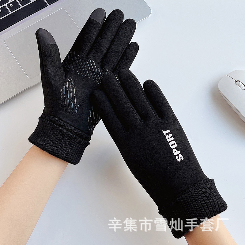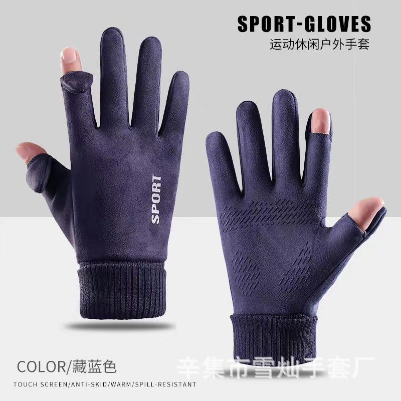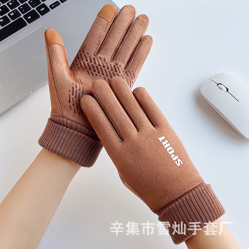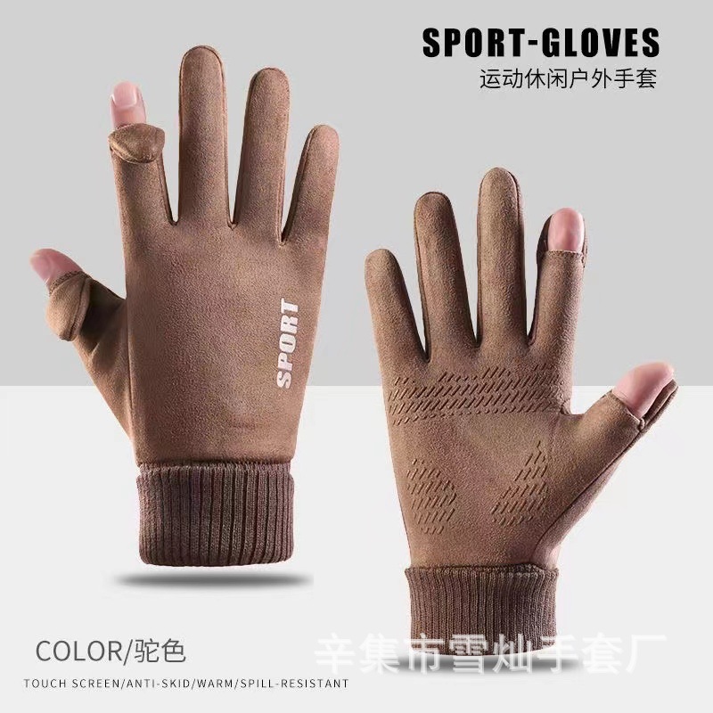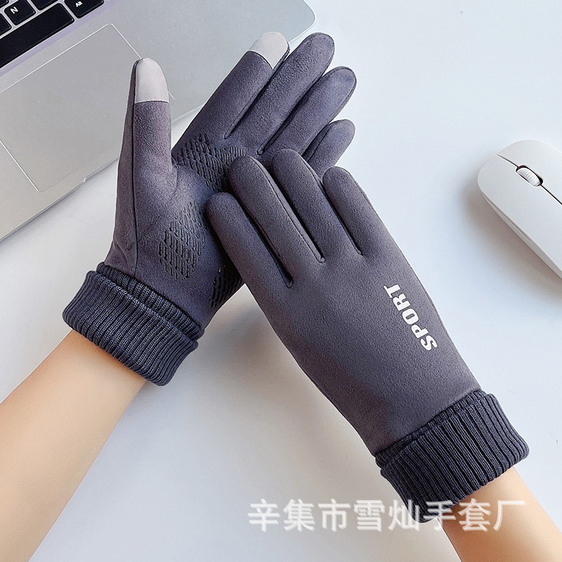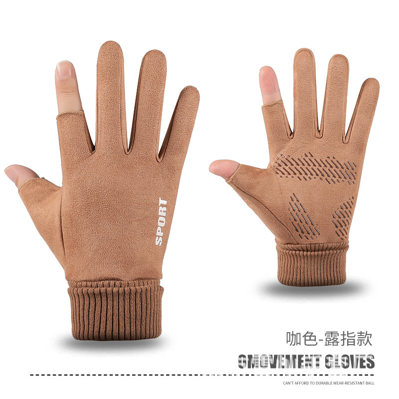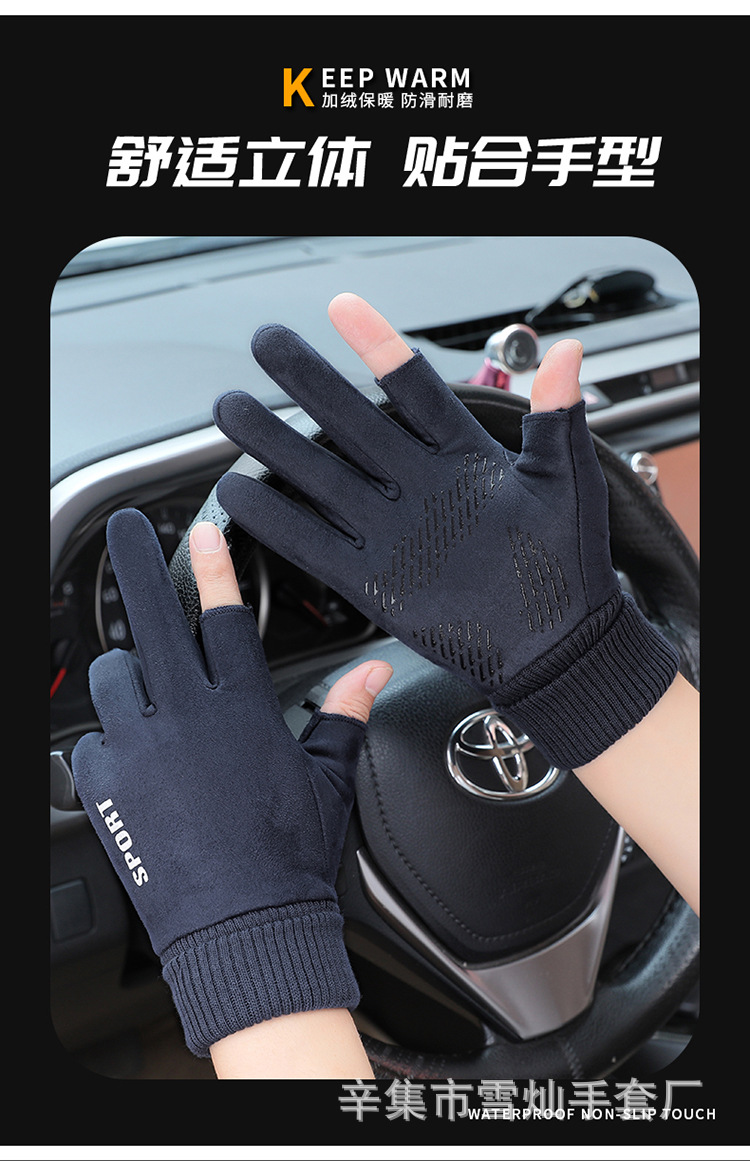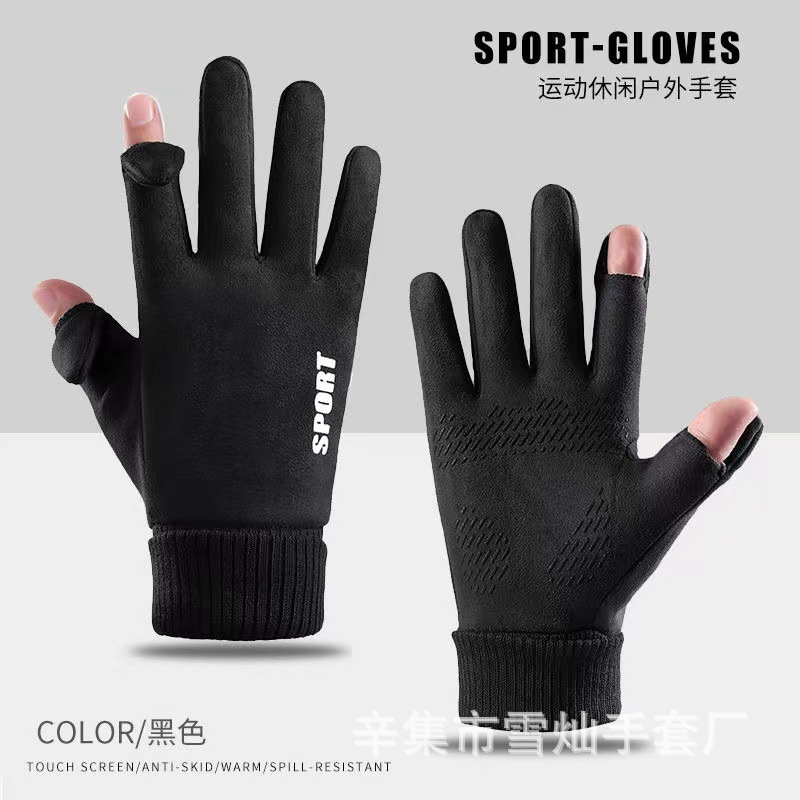 가을과 겨울에 따뜻한 터치 스크린 야외 사이클링을위한 남성과 여성을위한 스웨이드 벨벳 커프 커플 두 손가락 플러스 벨벳 두꺼운 장갑