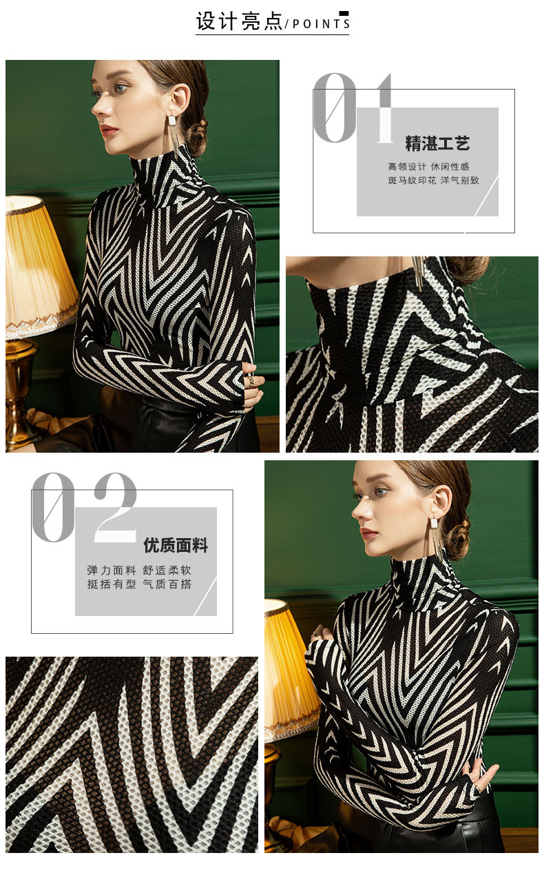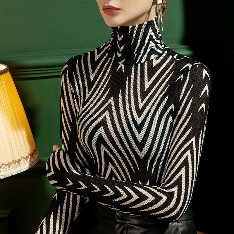 가을 새로운 하이 넥 레이스 베이스 셔츠 여성용 슬림핏 스트라이프 프린트 파일 칼라 내부 긴 소매 탑