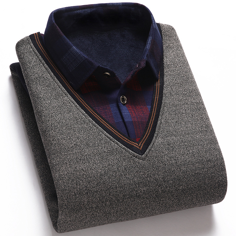 [기모 농축] 새로운 남자의 가짜 투피스 셔츠 칼라 스웨터 남자의 중년 및 노인 하의 스웨터 내부