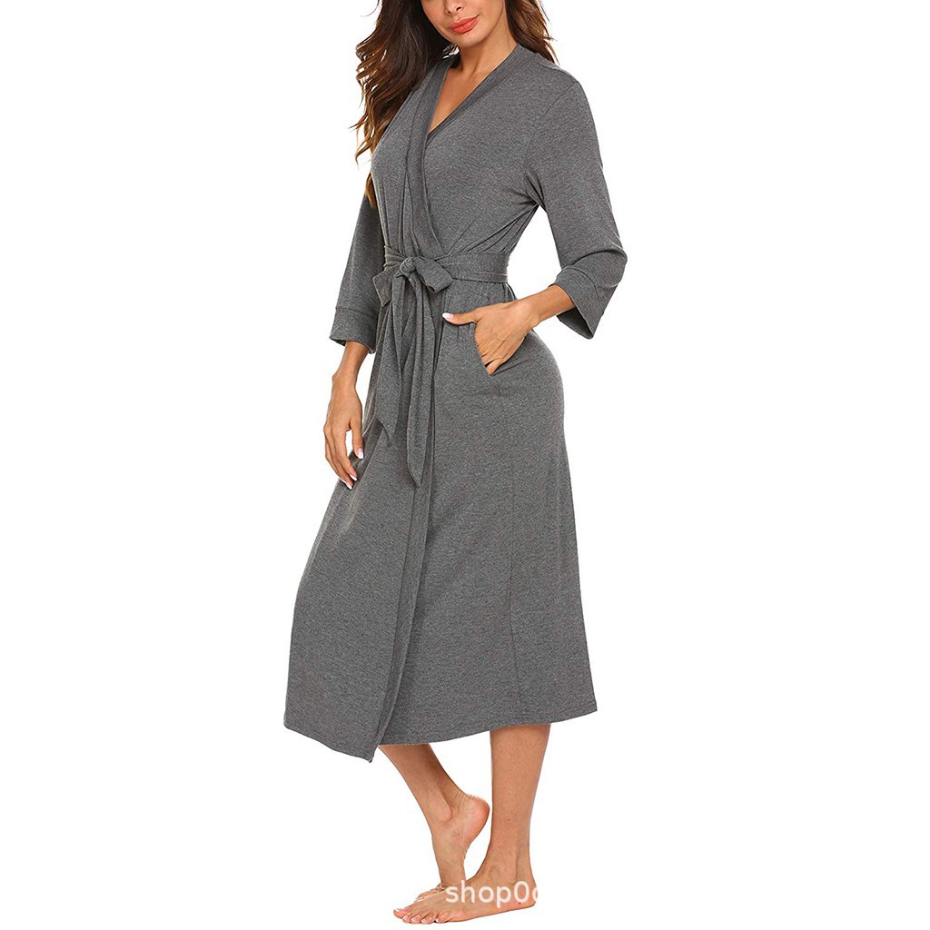 2025 유럽과 미국 스타일의 브이넥 레이스업 7부소매 솔리드 컬러 롱 홈 나이트가운스토어 가기