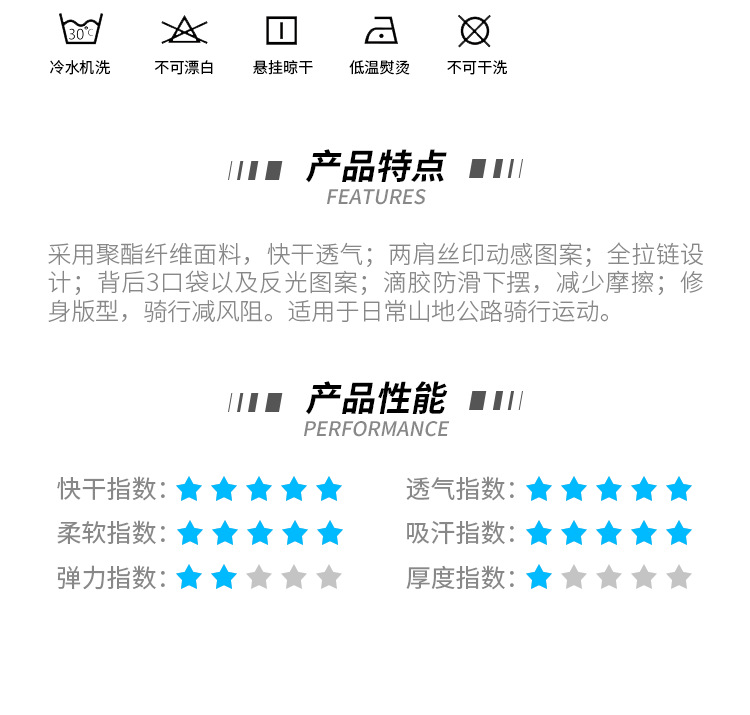 Function(功能) Breathable(透气) / Quick Dry(快干) / Anatomic Design(三维立体剪裁) /Wicking(吸湿排汗)