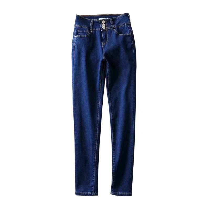 유럽과 미국 가을 하이 웨이스트 배꼽 3 버튼 청바지 여자의 모든 경기 긴 라이트 블루 슬림 복숭아 연필 여자를 보여주는 다리스토어 가기