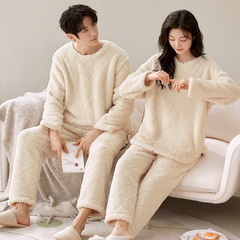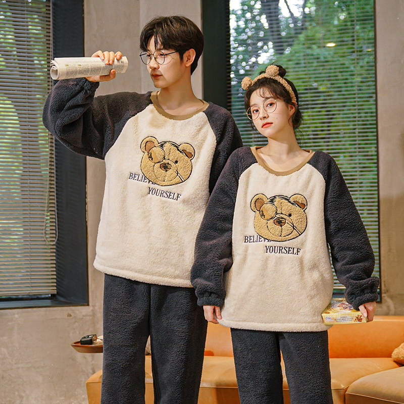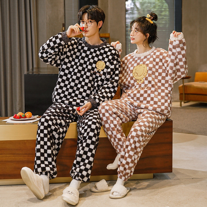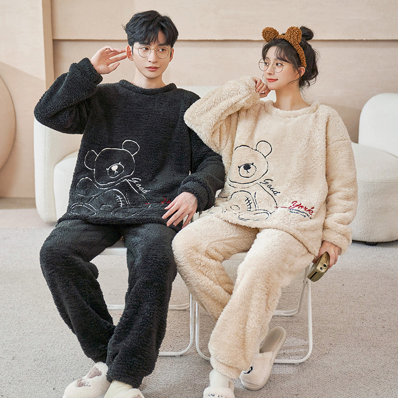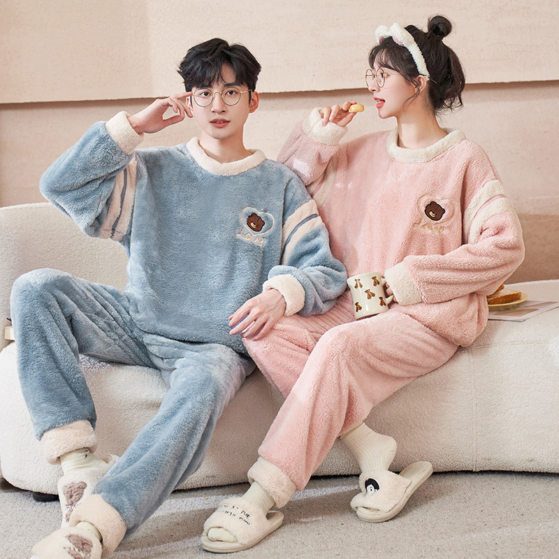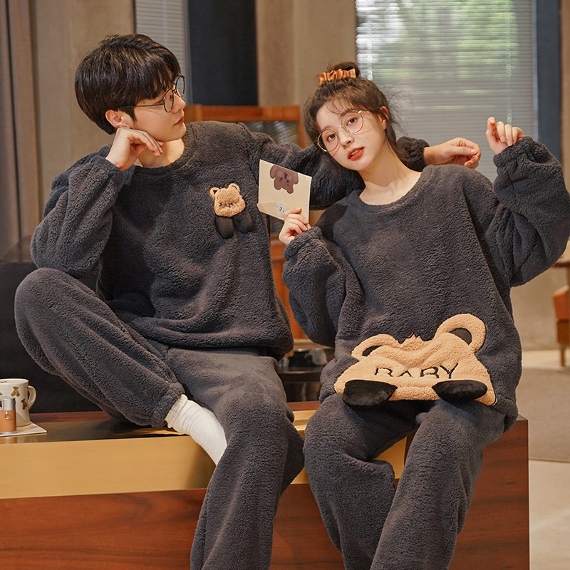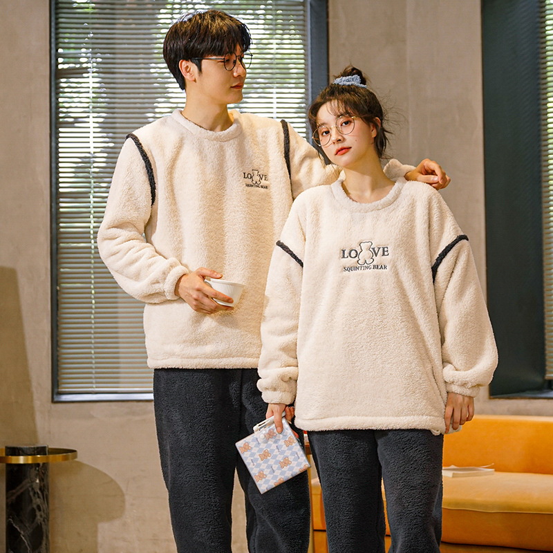 새로운 플란넬 커플 잠옷 여자의 기모 두꺼운 세트 남자의 느슨한 플러스 사이즈 따뜻한 산호 양털 가정 옷
