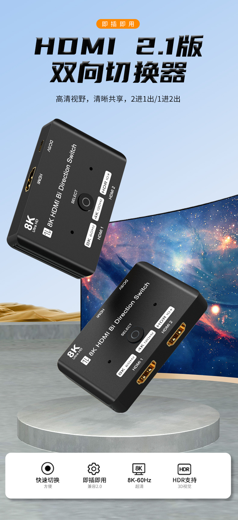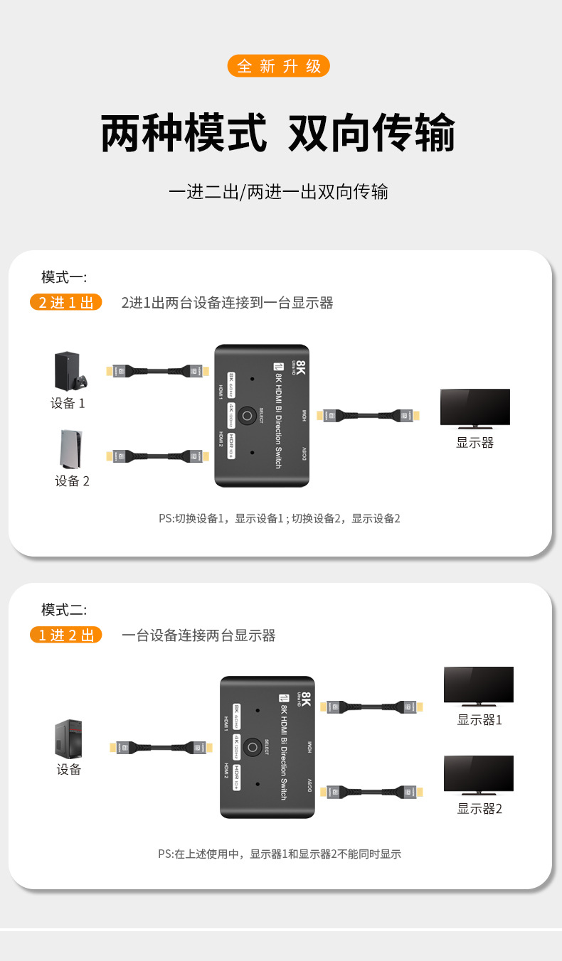 재고 HDMI 양방향 스위처 8K/60Hz 오디오 및 비디오 동기 변환 2 in 1 out/1 in 2 분할 화면스토어 가기