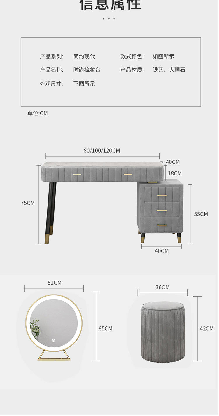• 전체 세트: 테이블 120 롱 + 사이드 캐비닛 + led 미러 + 라운드 스툴