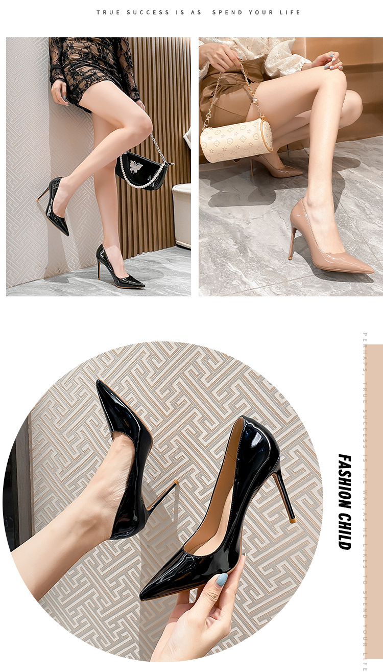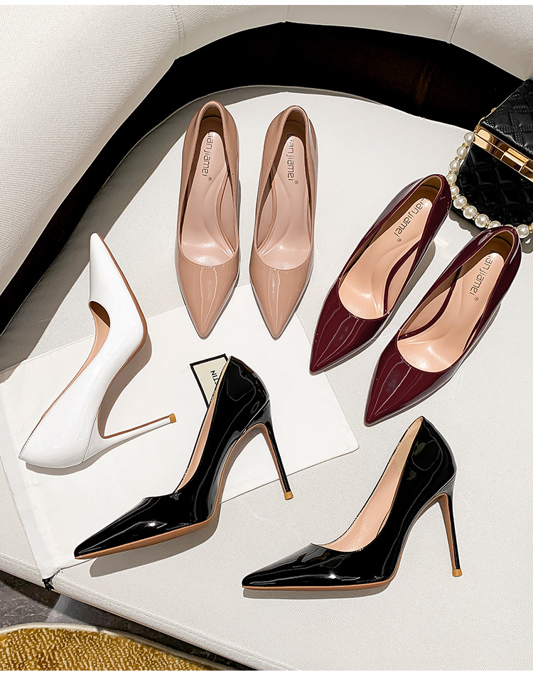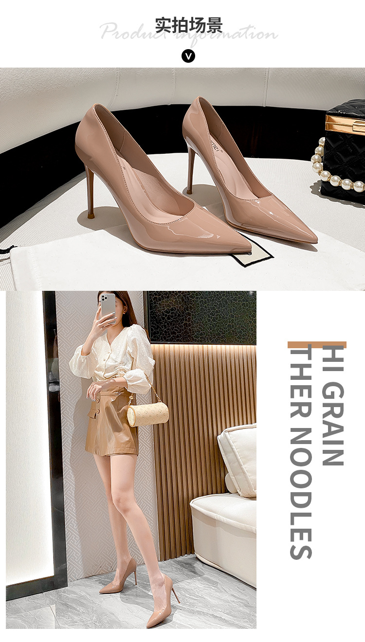 유럽과 미국 스타일의 심플한 얕은 입 슬리밍 스틸레토 여성 신발 2025 봄 새로운 누드 컬러 뾰족한 페이턴트 가죽 하이힐스토어 가기