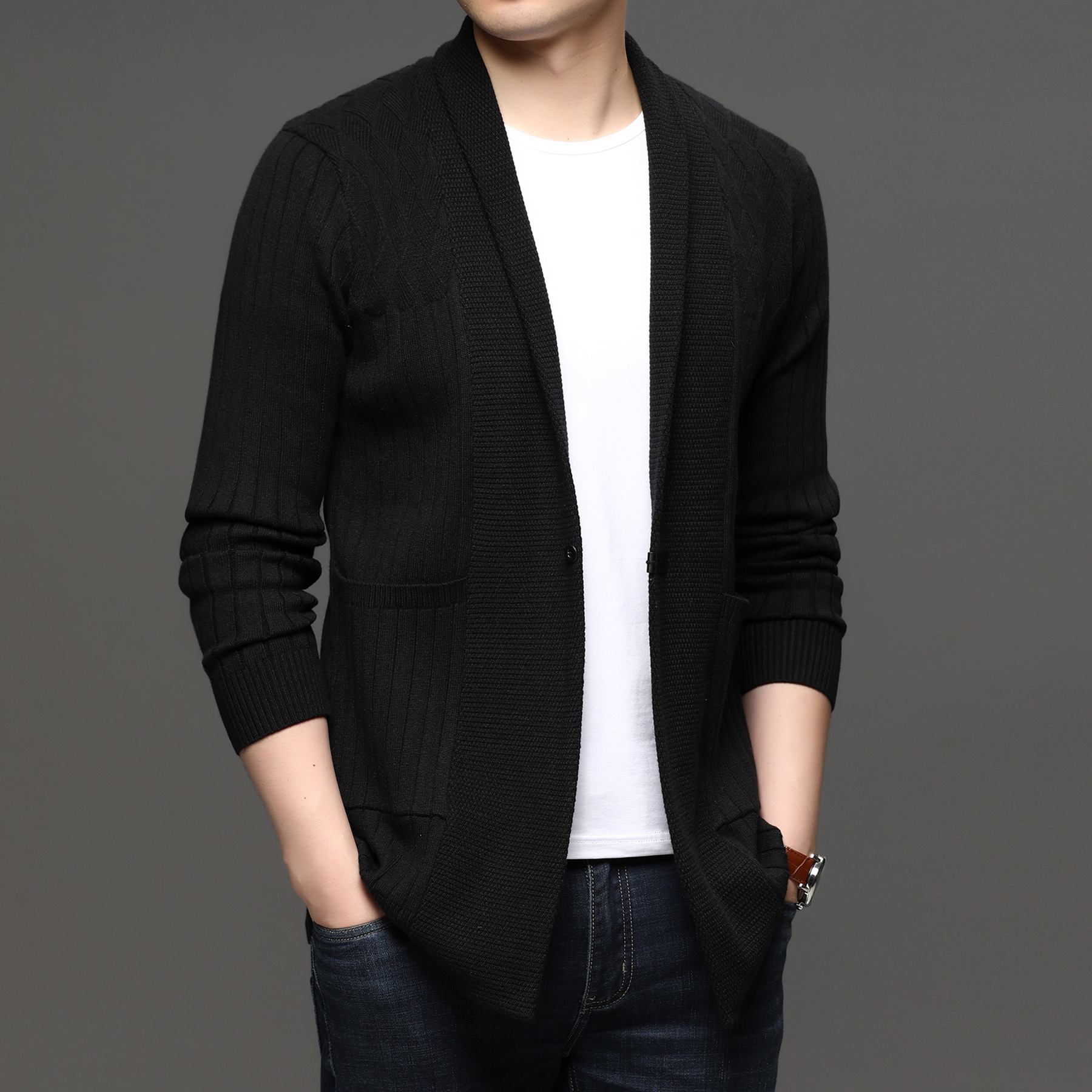 봄과 가을 남자 단색 코트 중간 길이 한국 스타일 잘 생긴 남자 스웨터 가디건 녹색 중년 유행 니트 스웨터