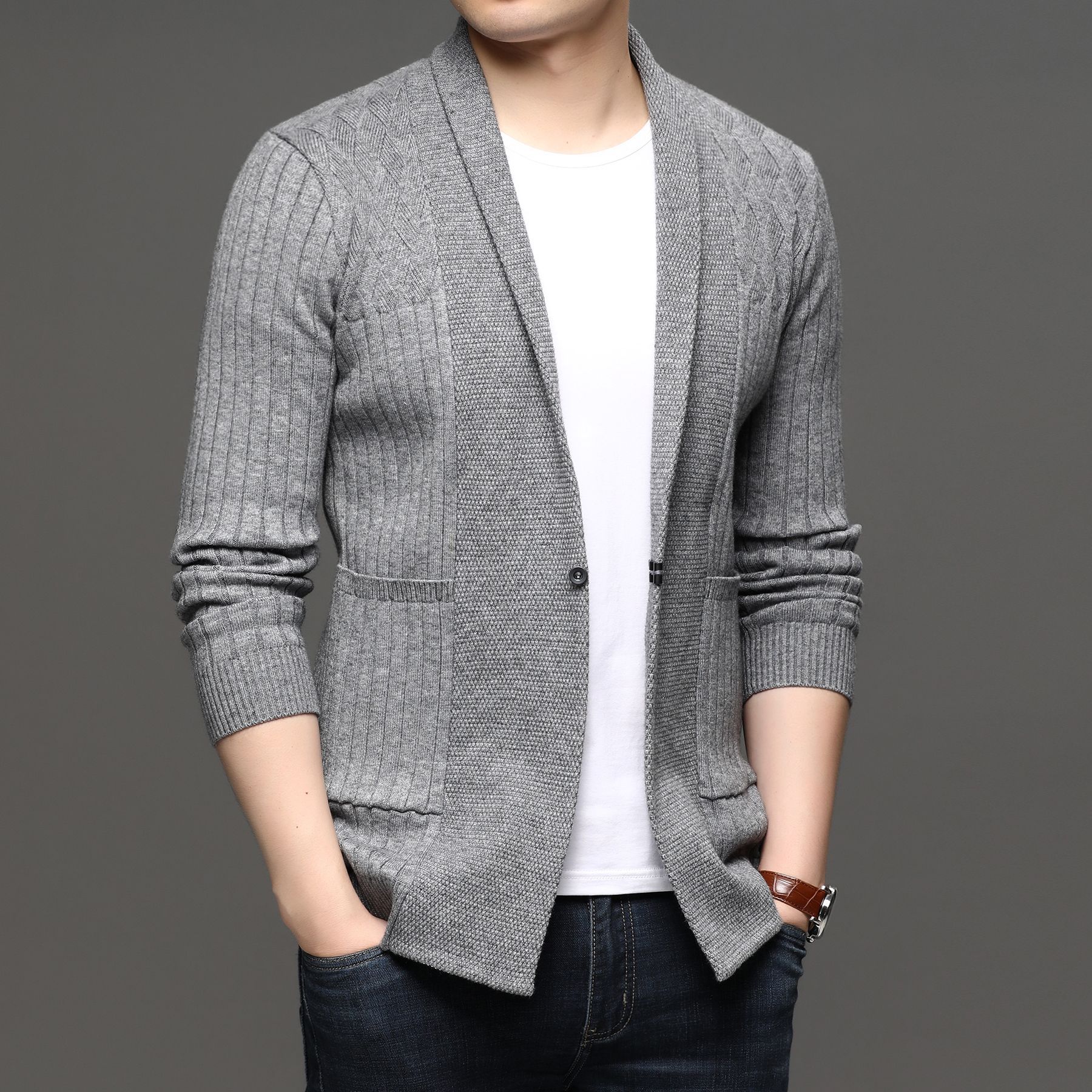 봄과 가을 남자 단색 코트 중간 길이 한국 스타일 잘 생긴 남자 스웨터 가디건 녹색 중년 유행 니트 스웨터스토어 가기