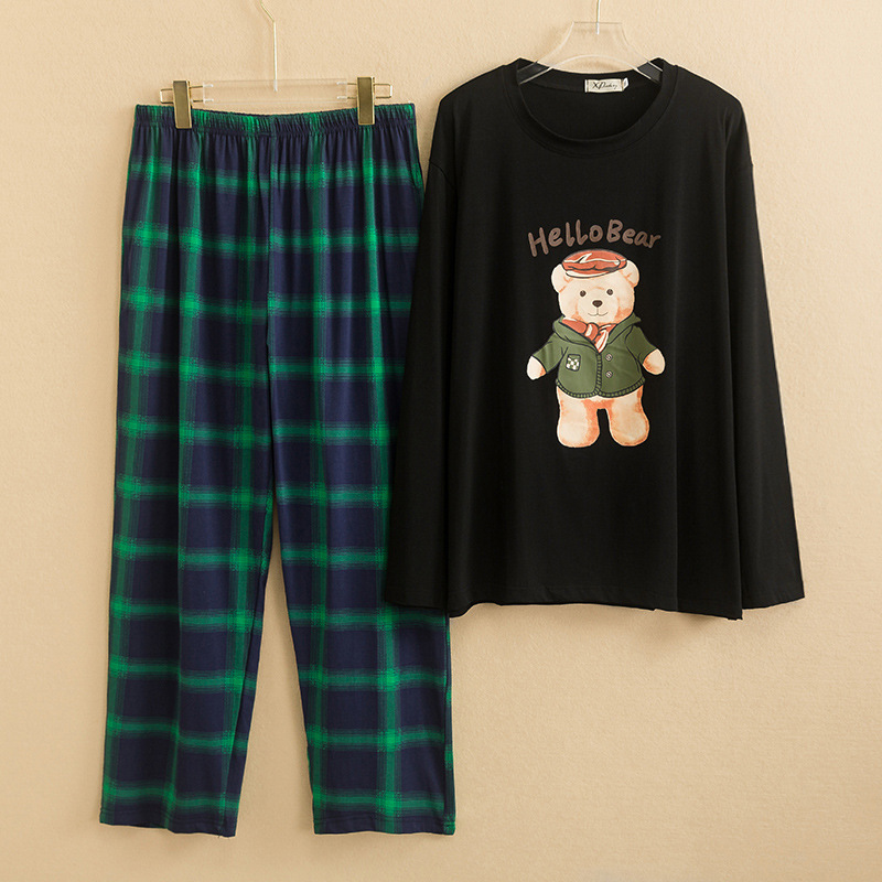 커플의 대형 잠옷 봄과 가을 니트 코튼 긴팔 여성용 홈 의류 남성 격자 무늬 만화 세트 느슨한 200kg스토어 가기