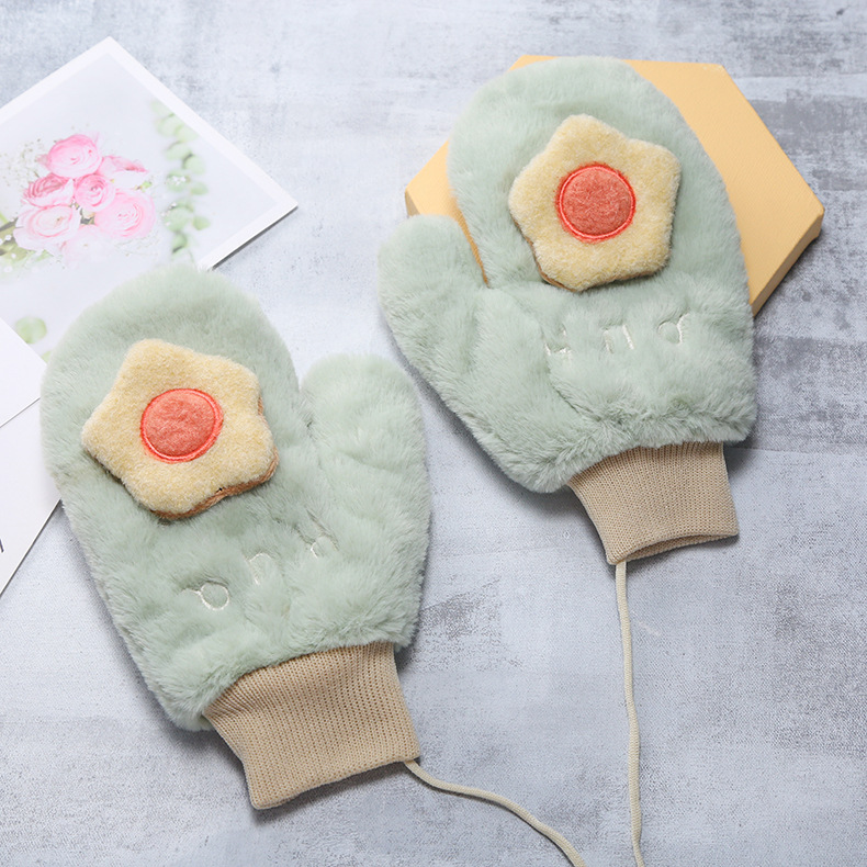 대학 스타일의 귀여운 큰 꽃 봉제 장갑 여성용 겨울 방한 기모 손가락으로 목에 밧줄이 달린 따뜻한 한국 스타일스토어 가기