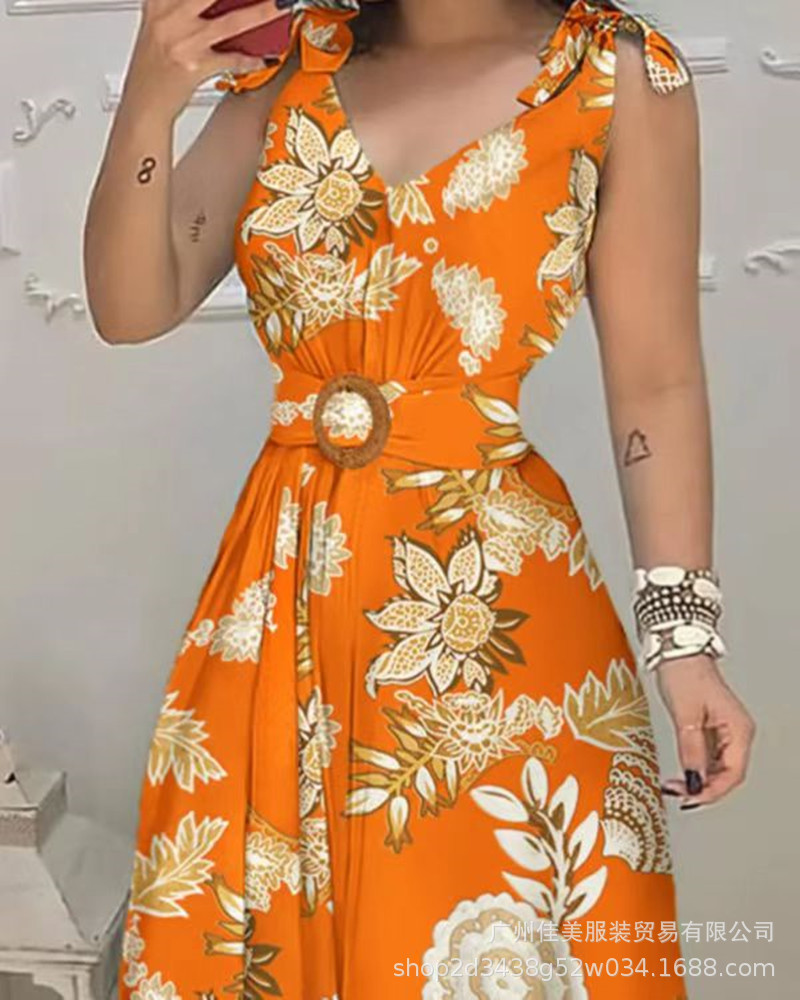 2022 전자상거래 공장 직송 원피스 여성용 프린트 벨트 포함 롱 스커트 슬림핏 다용도