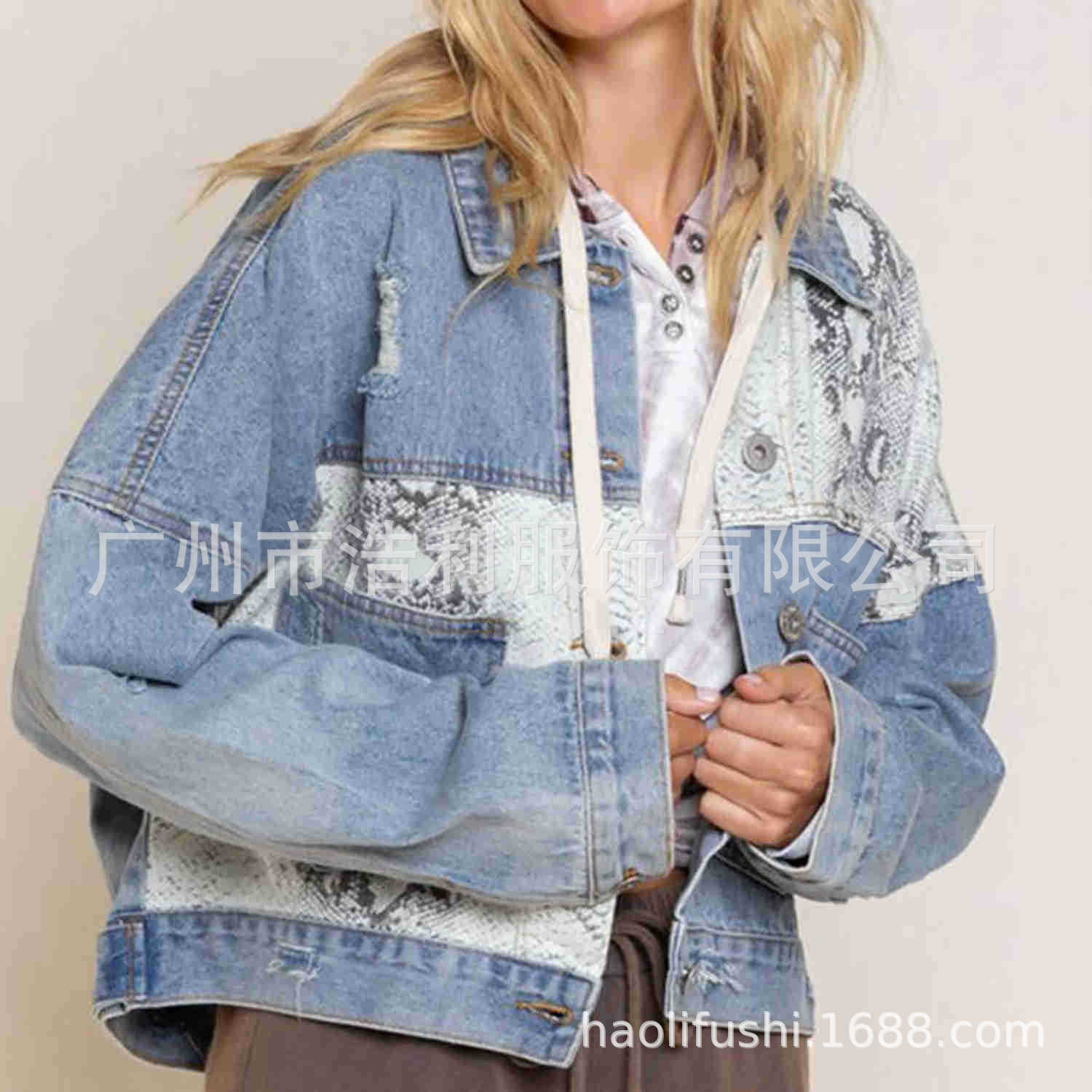 크로스 국경 가을과 겨울 아마존 데님 코트 여자의 긴 소매 독립 역 유럽과 미국 데님 재킷 코트 여자의 표범 바느질스토어 가기